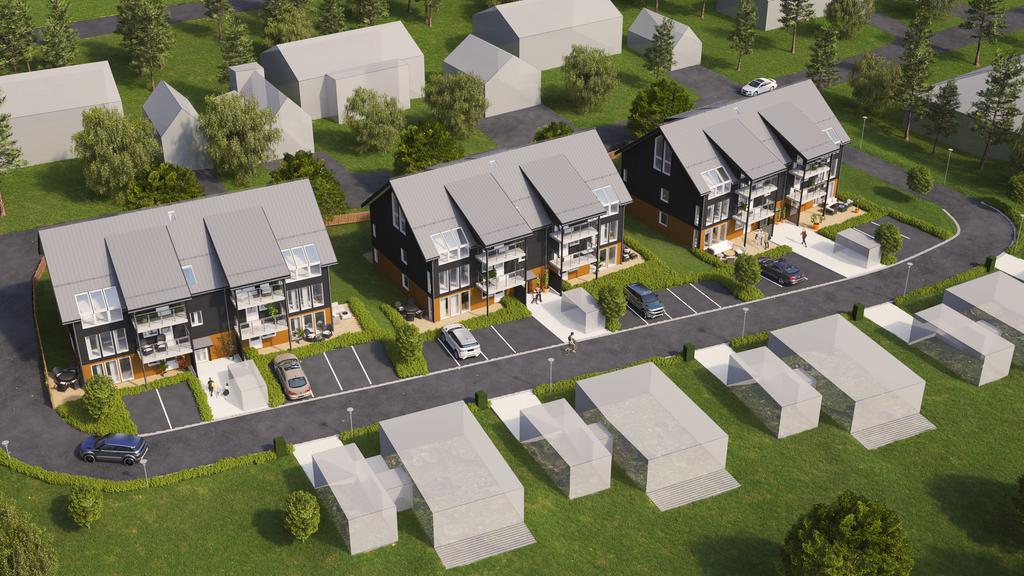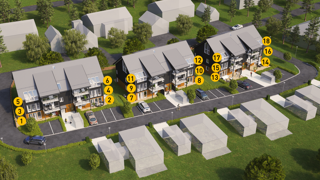 18 st lägenheter, alla om 4 rum & kök, går att göra om till 3 rum & kök om så önskas. Tre bostadshus med 3 våningar i varje, alla med hiss!