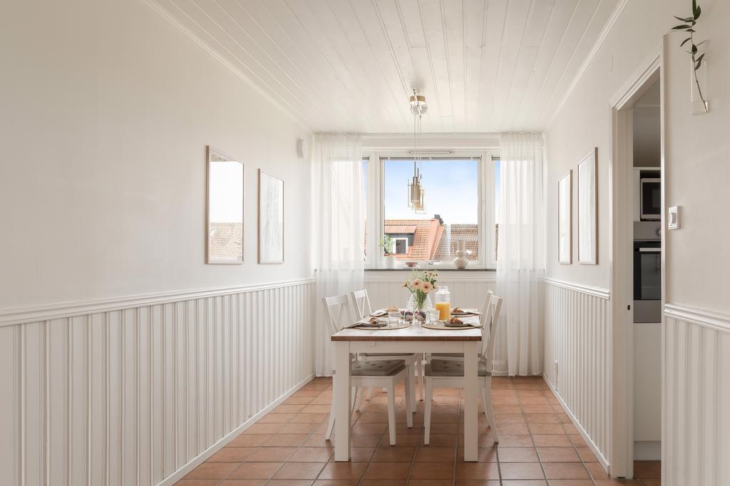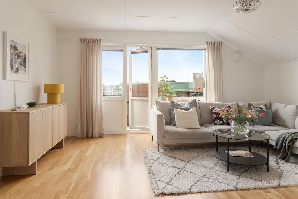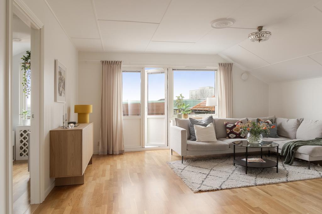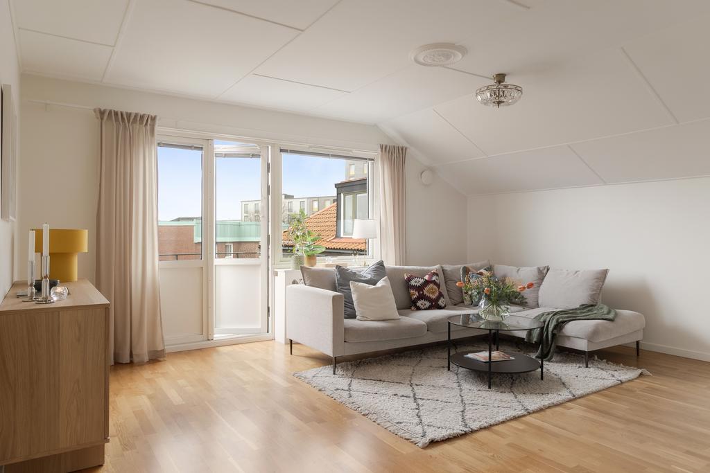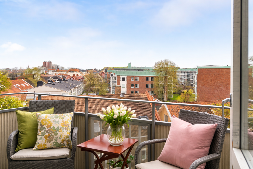 Central takvåning med balkong i sydväst och utsikt över Falkenbergs takåsar