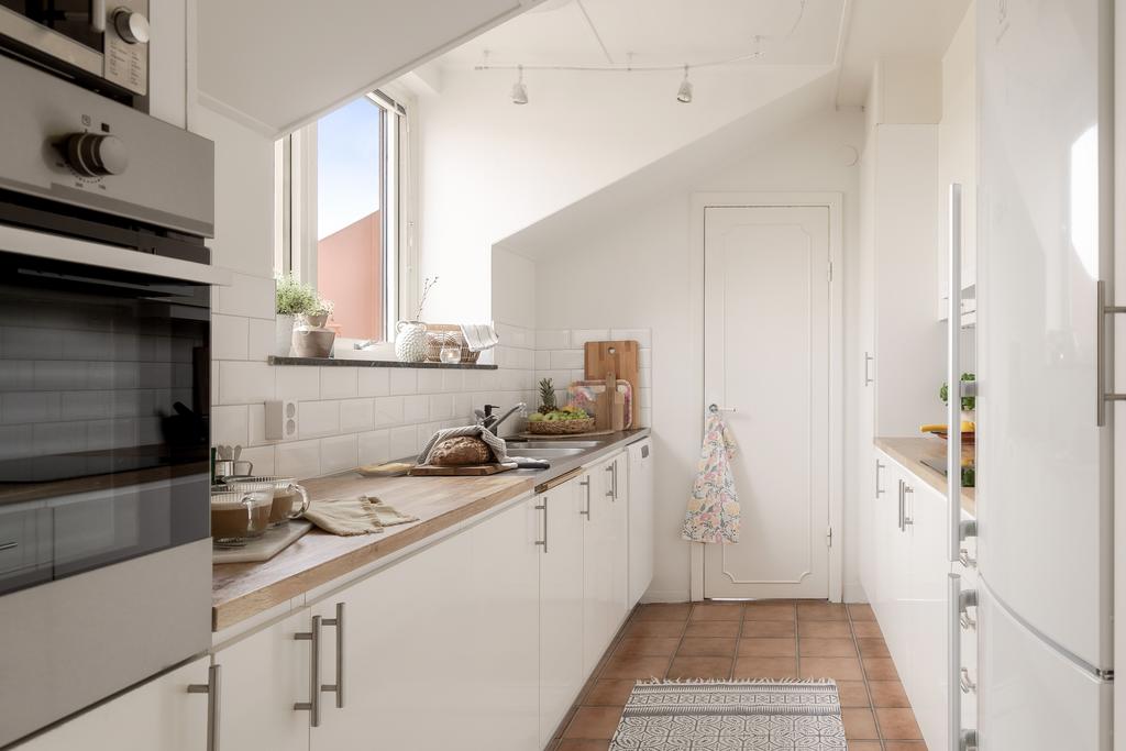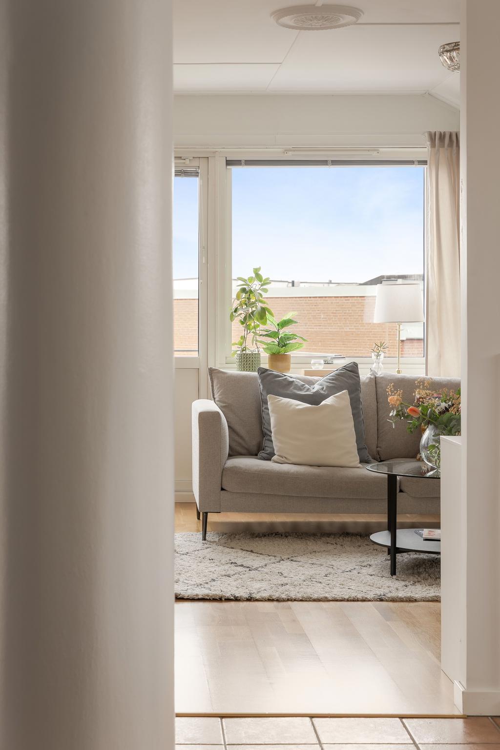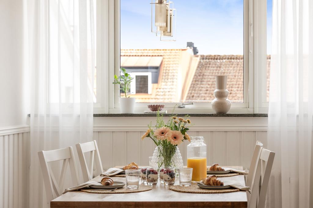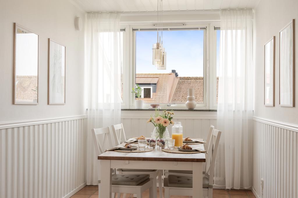 Central takvåning med balkong i sydväst och utsikt över Falkenbergs takåsar