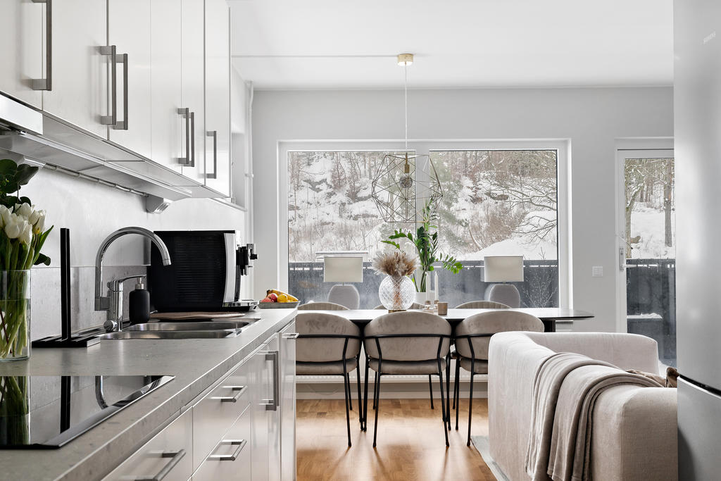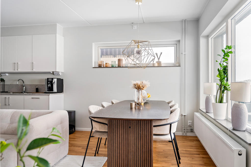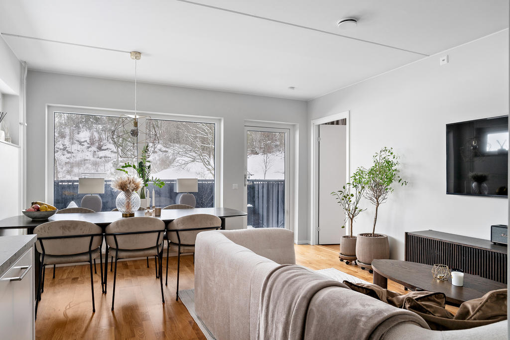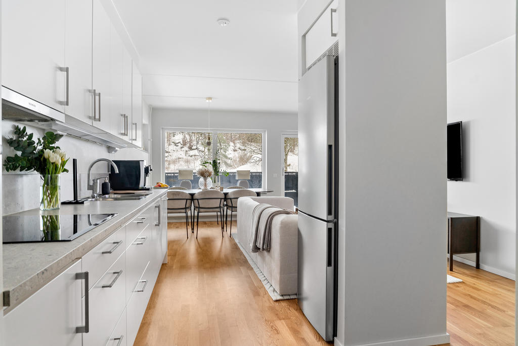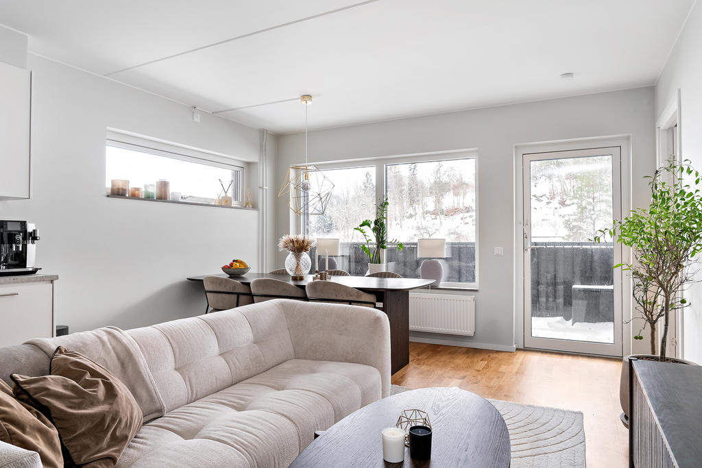 Det stilrena köket tillsammans med vardagsrummet har en öppen planlösning och blir den självklara samlingsplatsen när familj och vänner bjuds hem. Här finns en given plats för matbord som enkelt kan erbjuda plats för ett större sällskap. I vardagsrumsdelen finns plats för soffgrupp och tv-möbel. Hela rummet präglas av ljus och har stora fönsterpartier. Utanför möts ni av de grönskande omgivningarna. Lägenheten är samtidigt helt fri från insyn. Den härliga balkongen är som ett extra rum under sommarhalvåret. Den omges av fin grönska och med trädtopparna i horisonten. Balkongen är placerad med bästa solläge åt sydväst med sol från lunch tills solen går ner bakom trädens toppar sent om kvällarna. Balkongen ger plats för både utemöbler, grill och grönskande växter, helt klart en oas att njuta av.