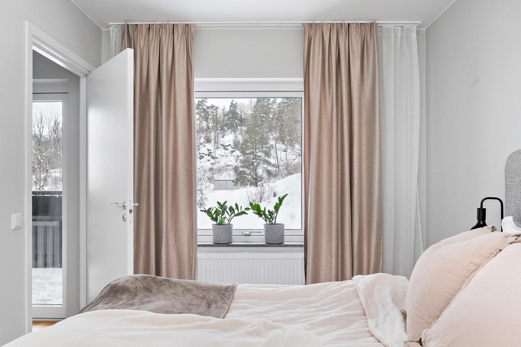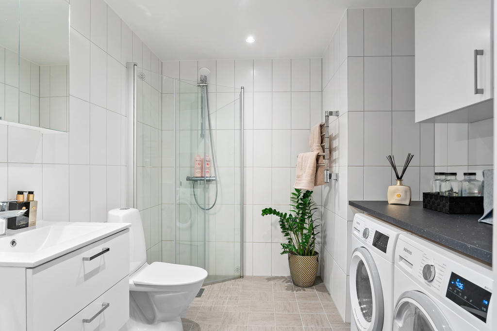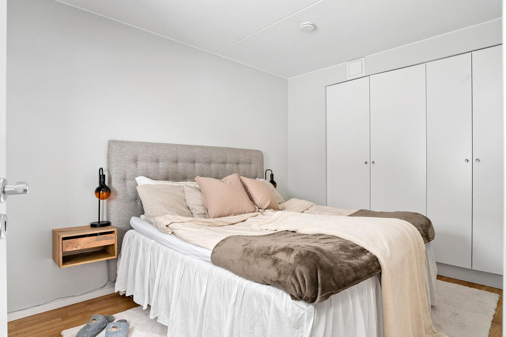 Utöver de sociala ytorna kring kök och vardagsrum finns ett sovrum som nås från vardagsrummet. Sovrummet har plats för dubbelsäng och förvaringsmöbler. Det ljusa, helkaklade, badrummet med duschhörna innefattar även praktiskt arbetsbänk, tvättmaskin och torktumlare.