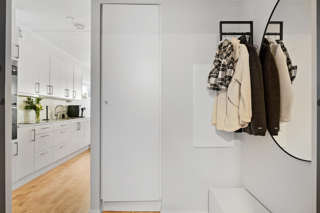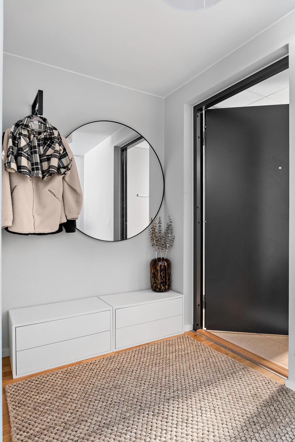 Hallen är väl tilltagen och här finns förvaringsmöjligheter samt goda avhängningsmöjligheter för ytterkläder och skor.