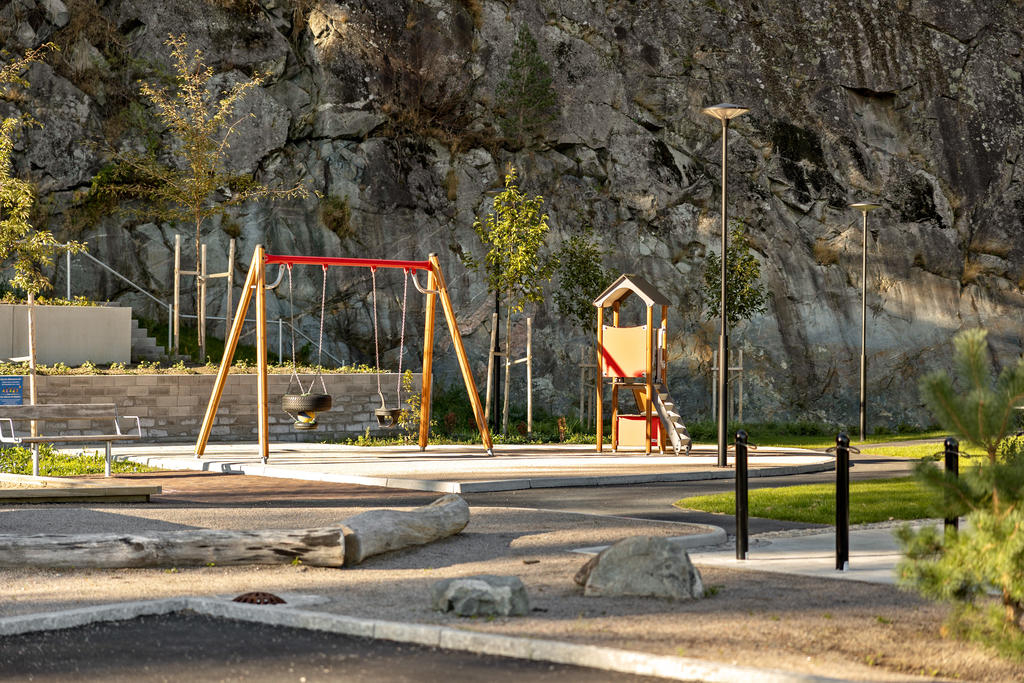 På föreningens gård finns grönska, lekplats och sittgrupper.