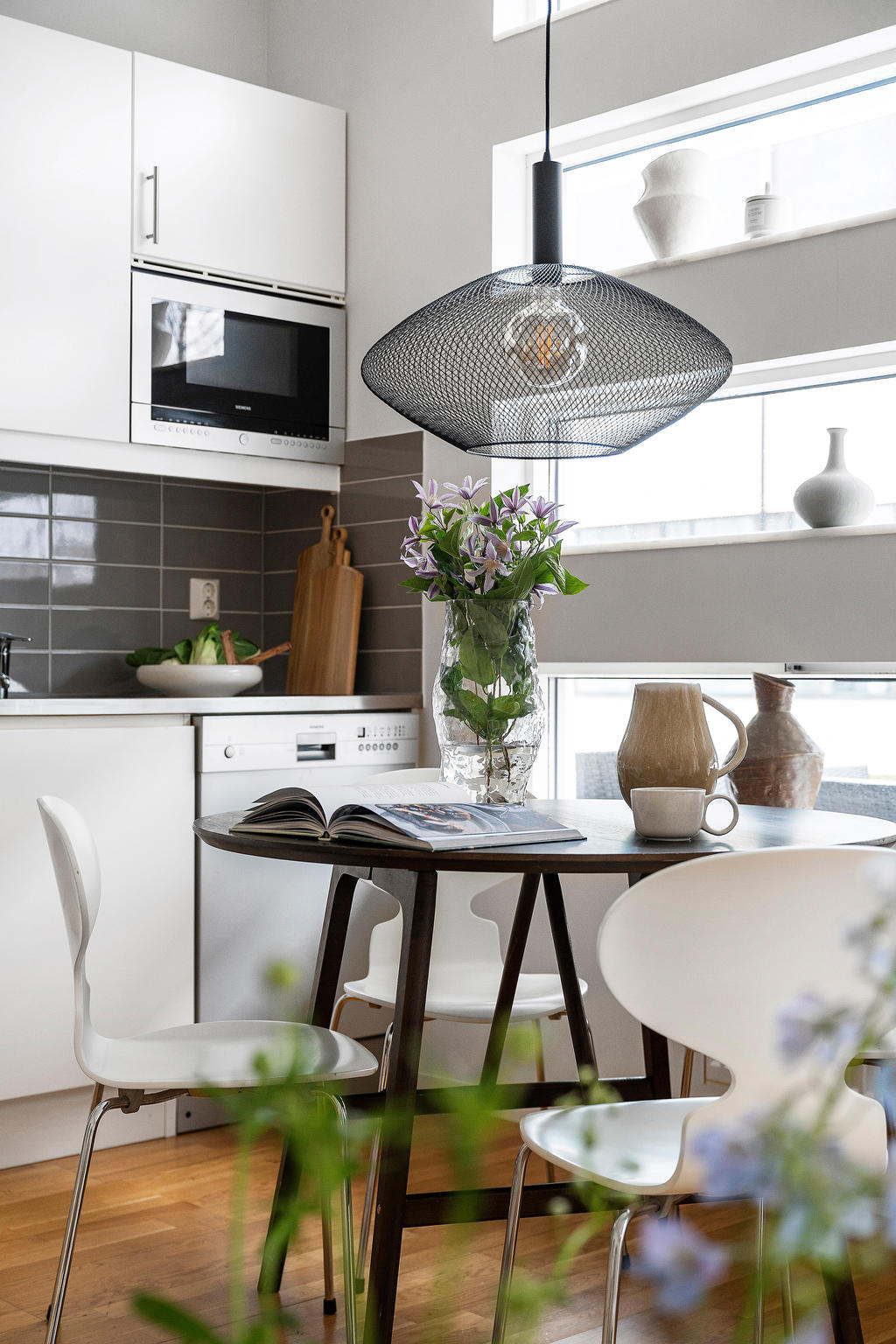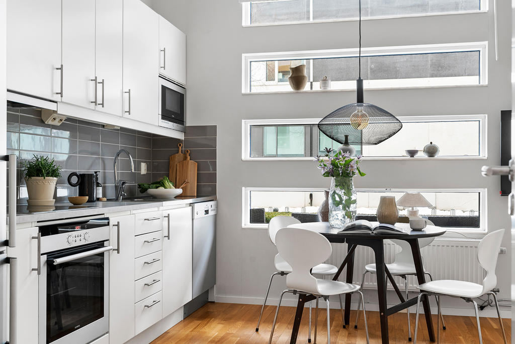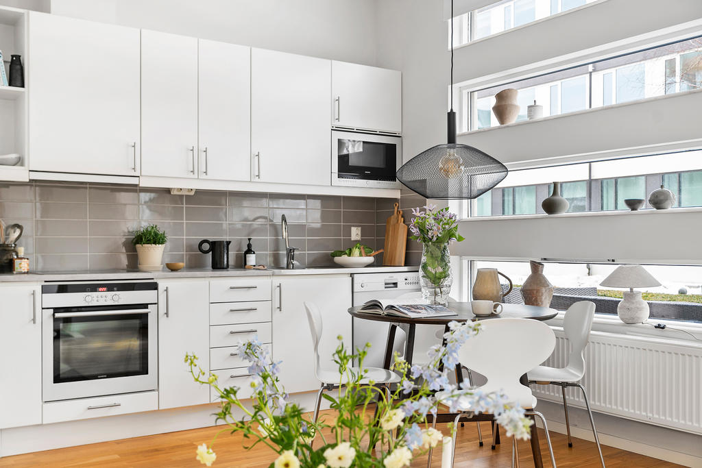 Planlösningen är social och inbjudande där kök och vardagsrum smälter samman till en öppen och trivsam yta, perfekt för både lugna hemmakvällar och middagar i gott sällskap. Köket är stilrent utformat med moderna vitvaror, goda arbetsytor och smart förvaring, vilket gör det lika funktionellt som estetiskt tilltalande.