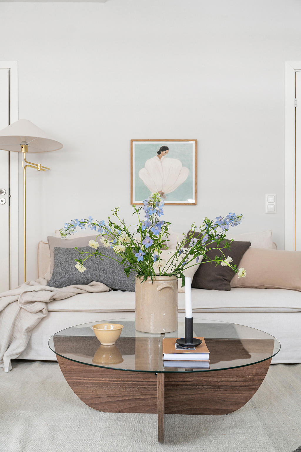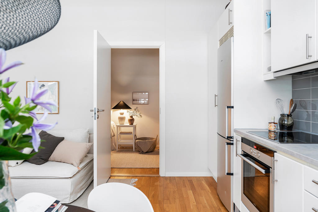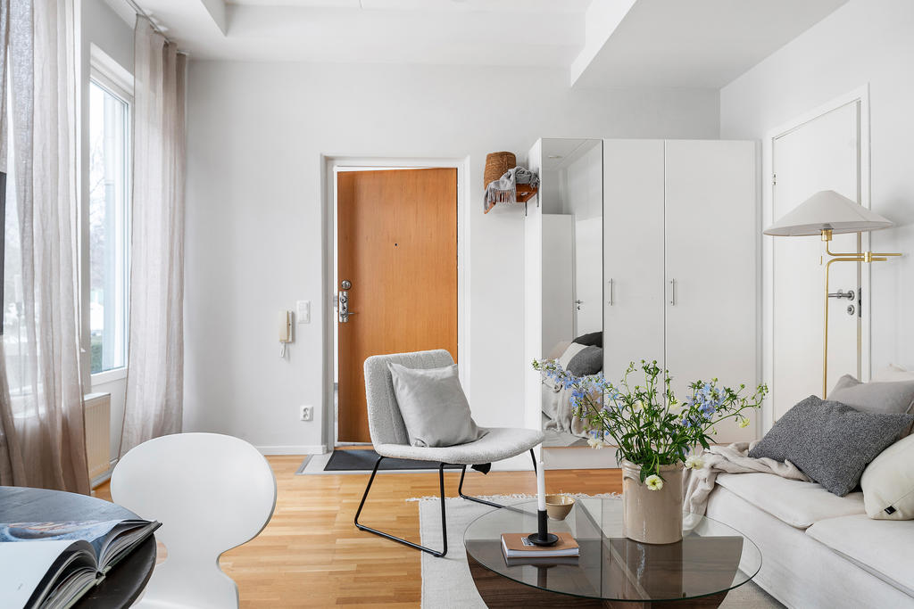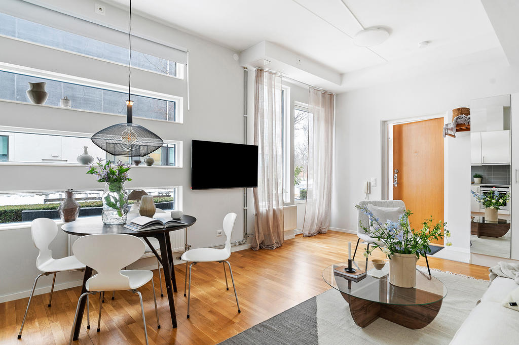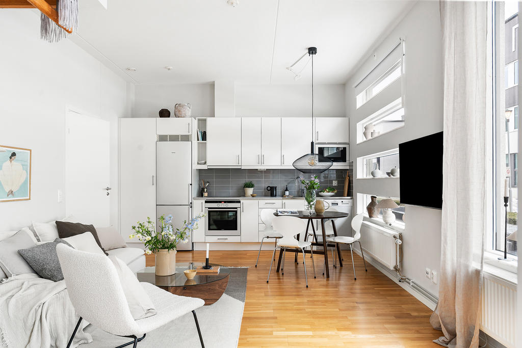 Redan när du kliver in möts du av en ljus och harmonisk känsla där varje kvadratmeter är välgenomtänkt. Den generösa takhöjden tillsammans med de stora fönsterpartierna skapar rymd och ett naturligt ljusflöde som ger bostaden liv under hela dagen. De ljusa ytskikten och det genomgående parkettgolvet bidrar till en modern och tidlös helhet.