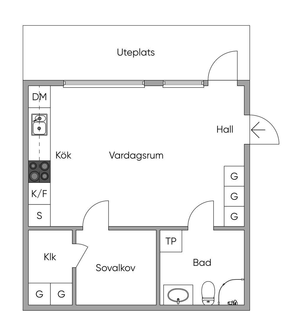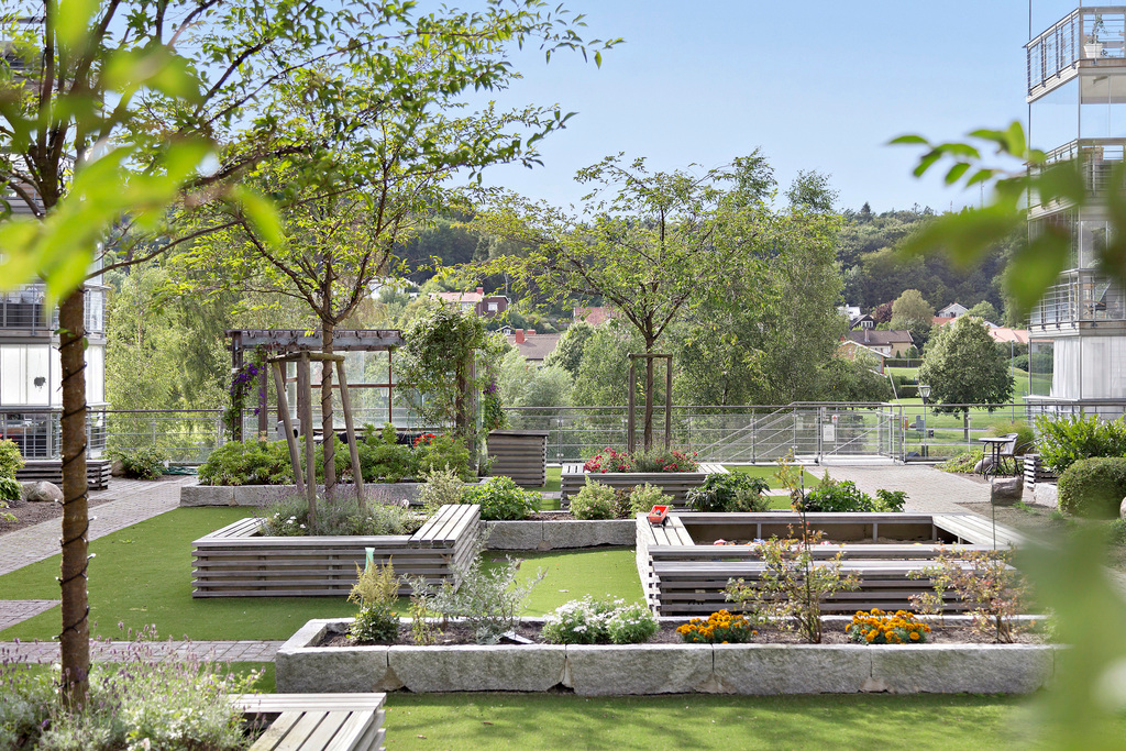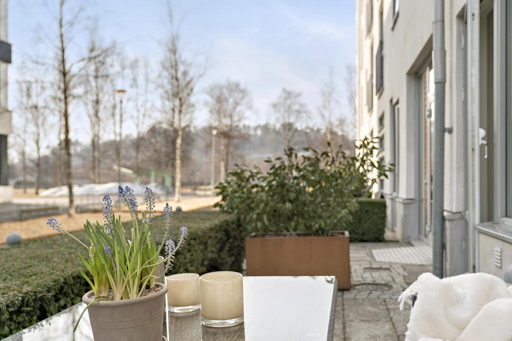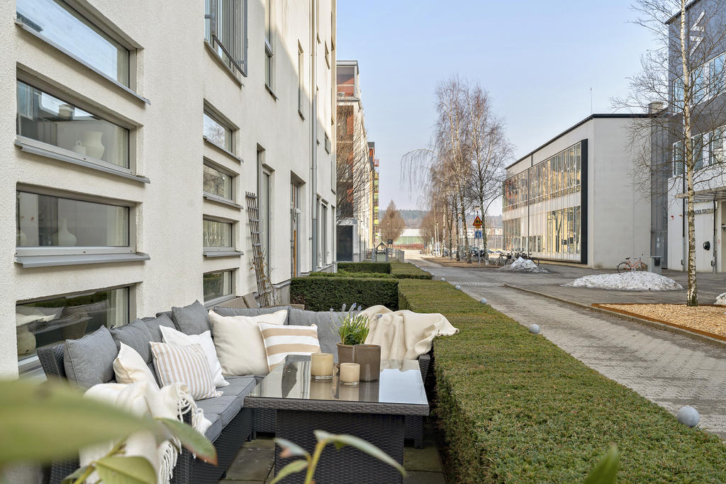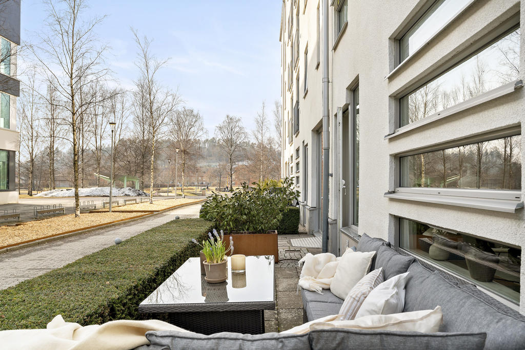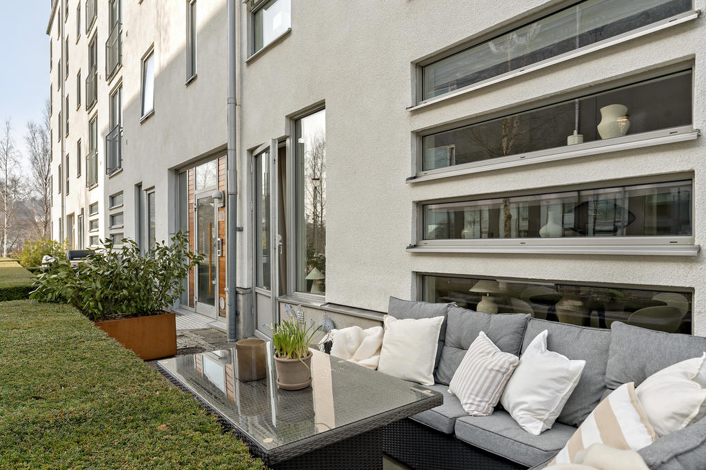 Från vardagsrummet kliver du rakt ut på bostadens kanske mest uppskattade inslag – den generösa uteplatsen. Här suddas gränsen mellan inne och ute ut och skapar en naturlig förlängning av hemmet. Föreställ dig morgonkaffet i solen, gröna växter som ramar in din egen oas eller långa sommarkvällar med vänner runt grillen. Här finns plats för loungemöbler eller matgrupp.