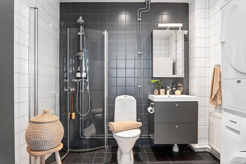 Det rymliga badrummet är helkaklat och utrustat med både tvättmaskin och torktumlare, en bekvämlighet som förenklar vardagen.