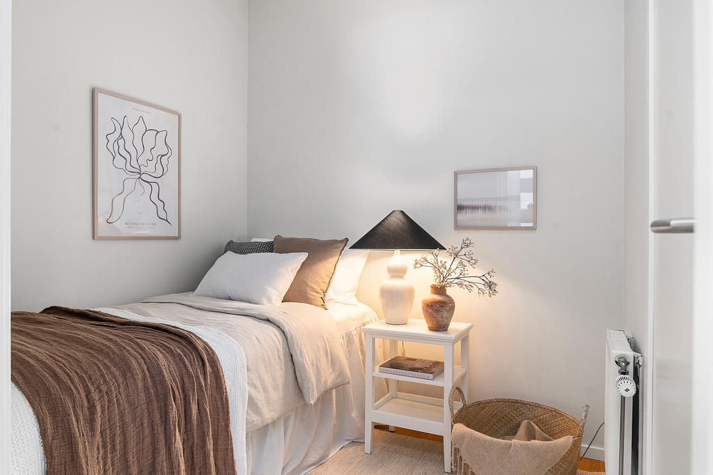 Sovalkoven är smart avskild med dörr, vilket ger en mer privat och ombonad sovdel med plats för en bredare säng. Intill ligger en praktisk klädkammare som erbjuder gott om förvaring och bidrar till ett lättorganiserat boende.