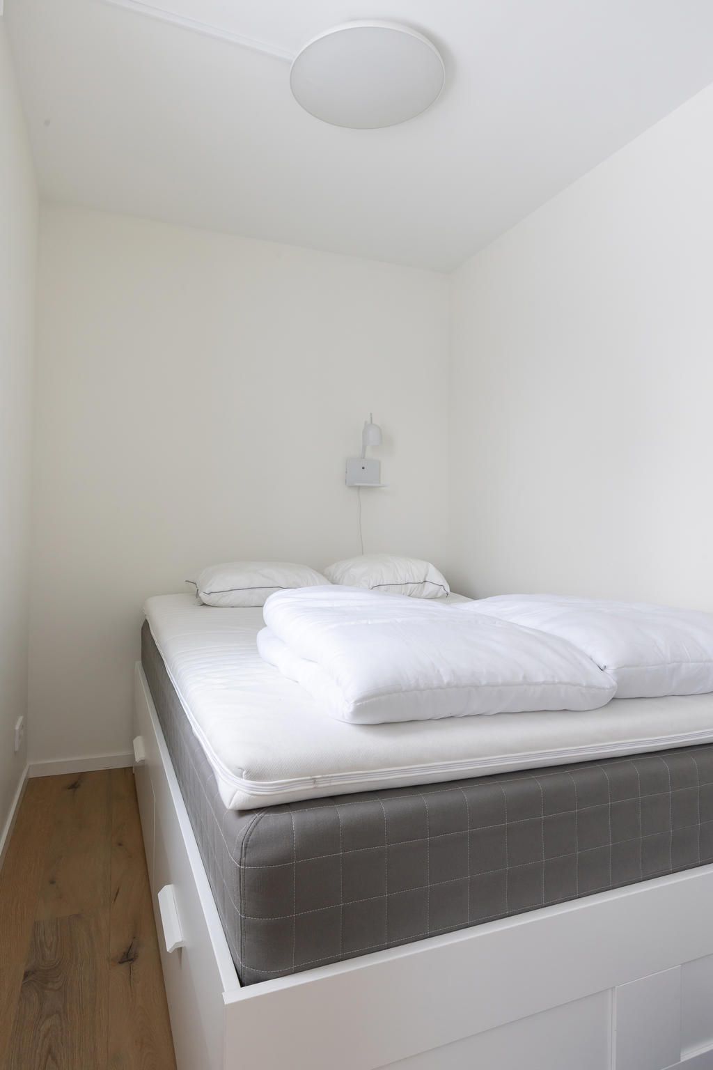 Lägenheterna på nedre plan disponeras som 2 rum och kök med ett sovrum. Där finns även en rymlig klädkammare eller förråd med fönster som kan användas som extra sovrum eller som flexibel yta beroende på behov.