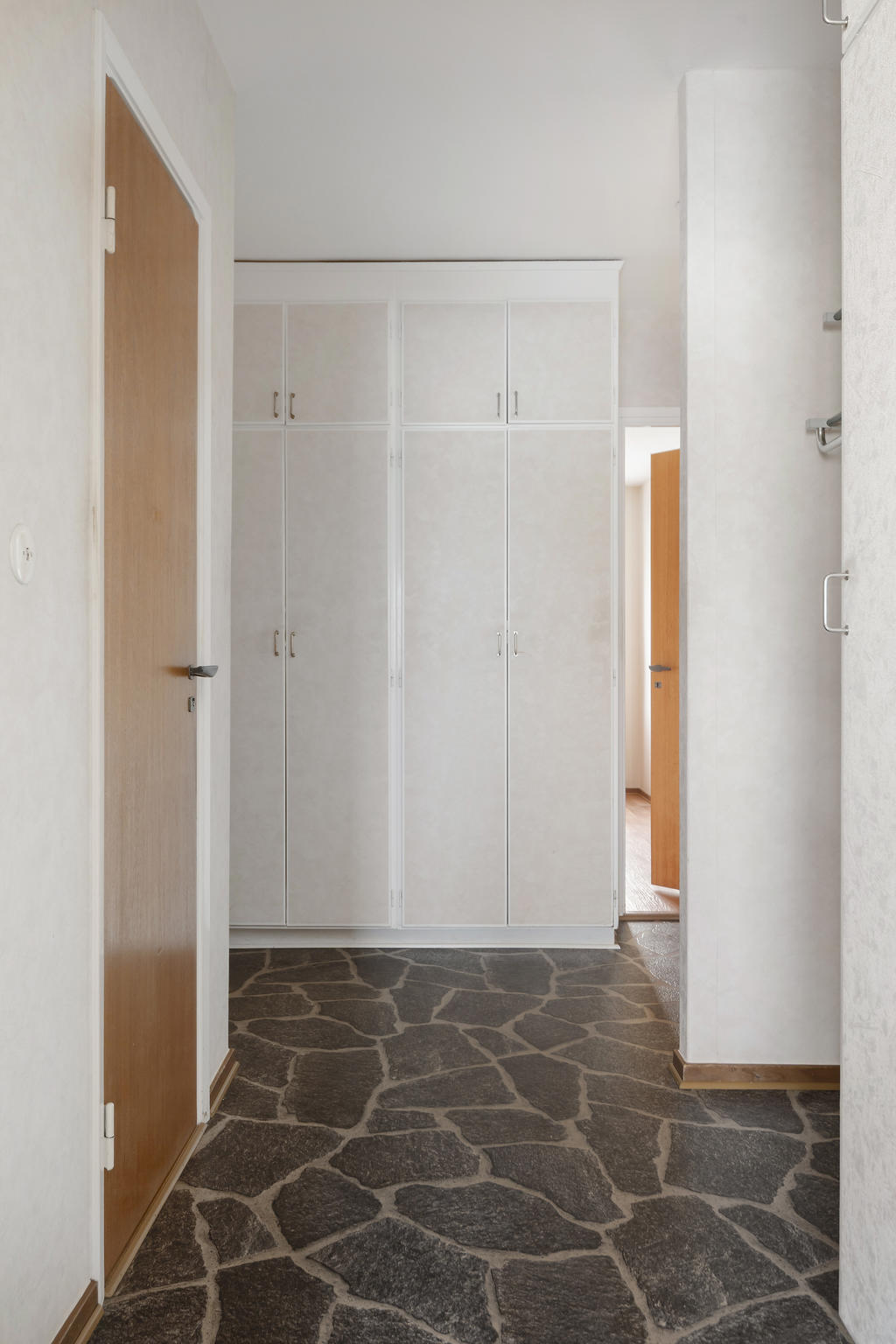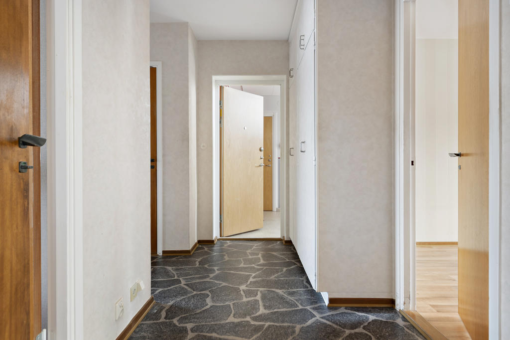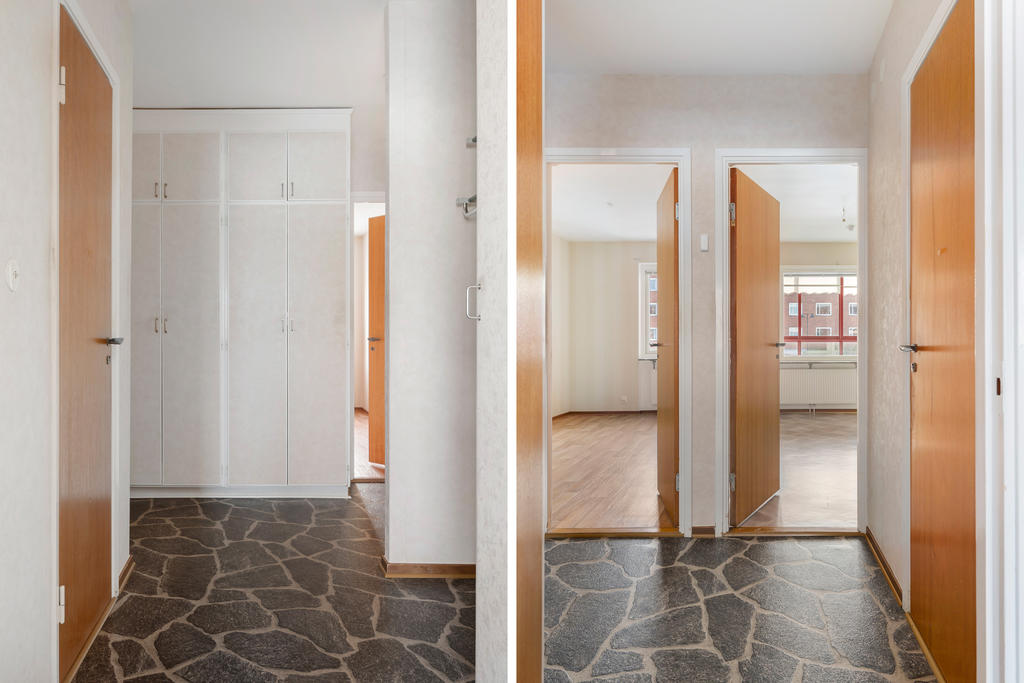 Du möts av en välkomnande hall med tåligt sten-/skifferliknande golv, gott om plats för avhängning och en rejäl garderobslösning som hjälper till att hålla ordning från första steget in. Hallen binder ihop bostaden på ett smidigt sätt och ger ett praktiskt flöde vidare till både rum och kök.