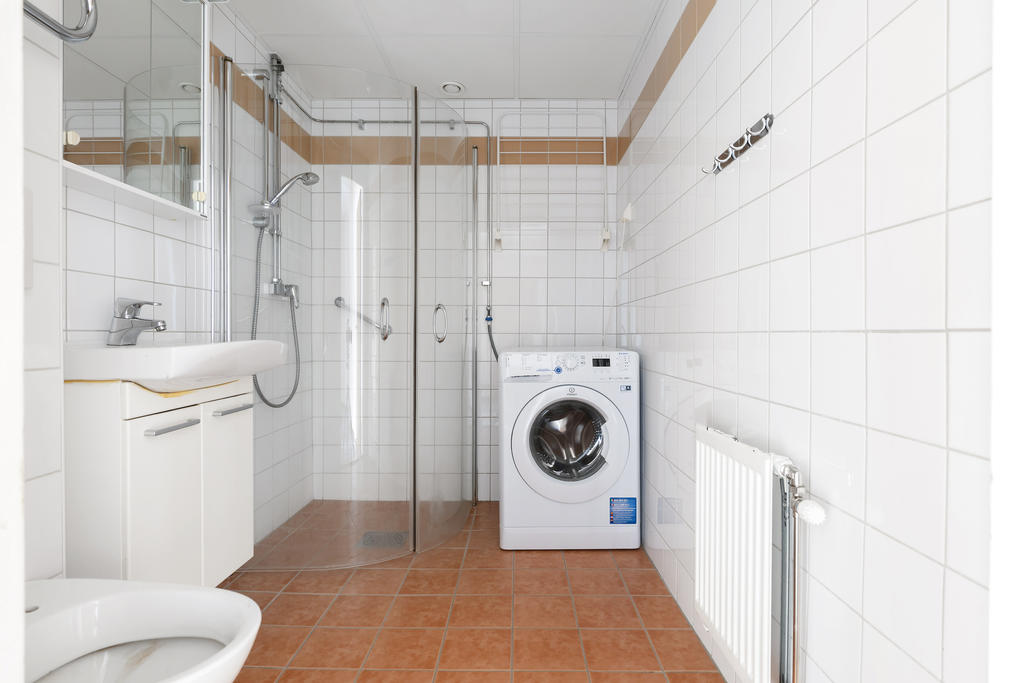 Badrummet är helkaklat i ljusa toner med duschhörna och en tydlig bonus i form av egen tvättmaskin. Praktiska ytor och bra förvaring i kommod/överskåp gör vardagen smidig.