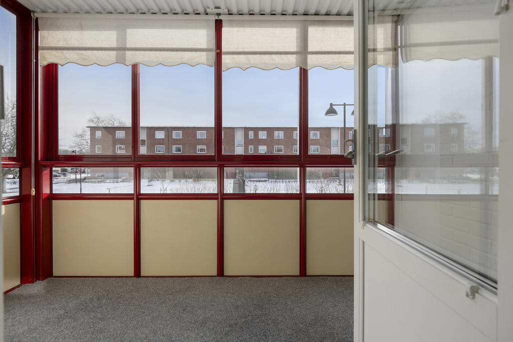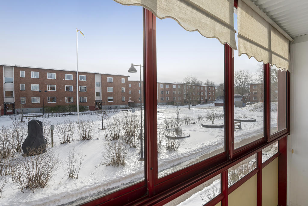Inglasad balkong med utsikt mot gård/området