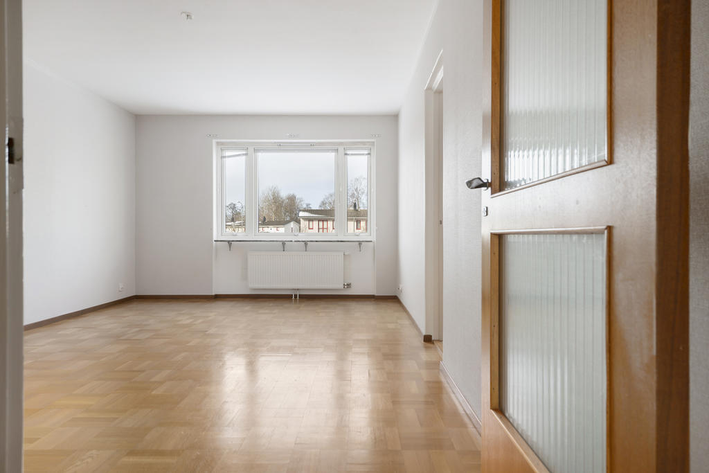 Vardagsrummet är rymligt och lättmöblerat med vackert parkettgolv och generöst ljusinsläpp. Här får du plats med både större soffgrupp och matplats/arbetsdel om du vill – ett rum som fungerar lika bra för lugna kvällar som för sociala tillställningar.