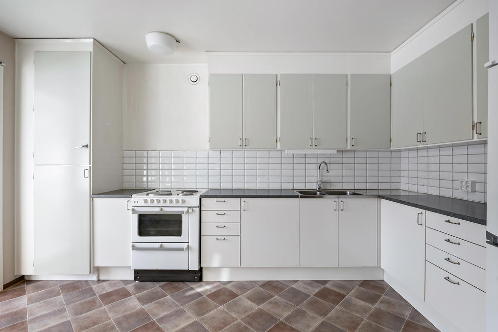 Köket är ljust och funktionellt med goda arbetsytor, många skåp och kaklat stänkskydd i klassiskt vitt. Här finns naturlig plats för matbord vid fönsterpartiet – perfekt för både vardagsfrukostar och middagar med vänner. Köket har dessutom en tydlig “hemmakänsla” och blir lätt en samlingspunkt.
