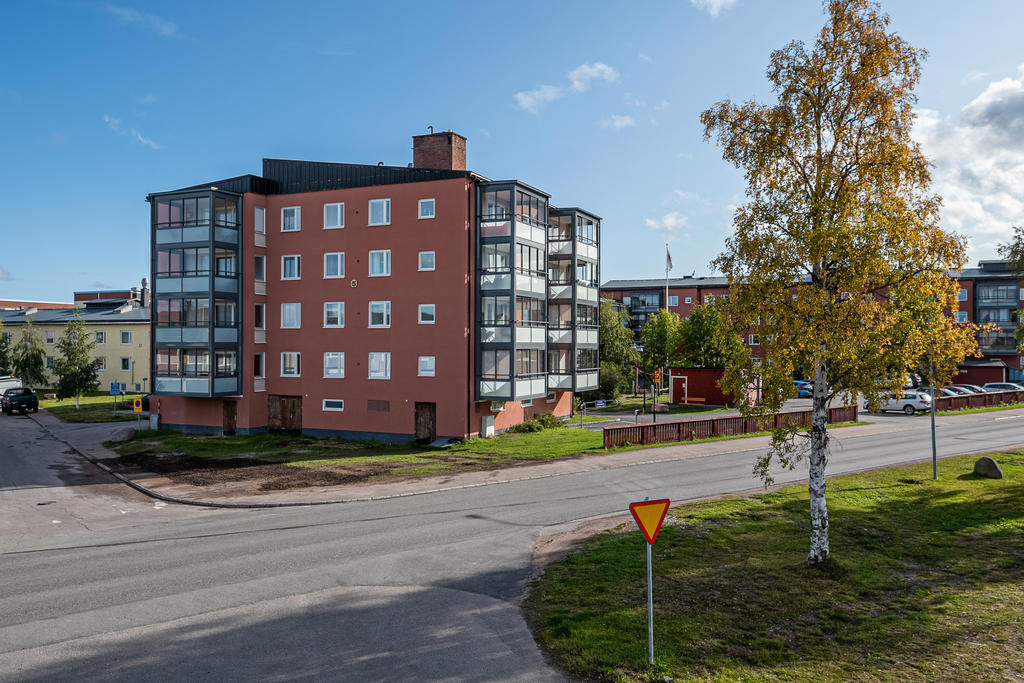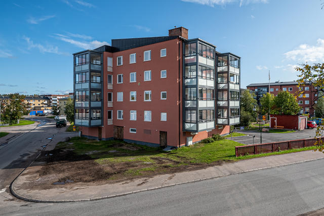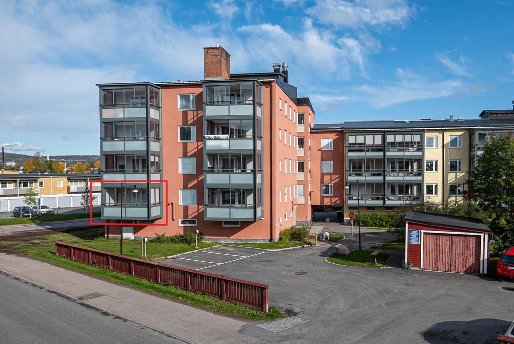 På första våningen på Norskavägen 4 erbjuds nu fyra rum och kök med inglasad balkong från 2019.