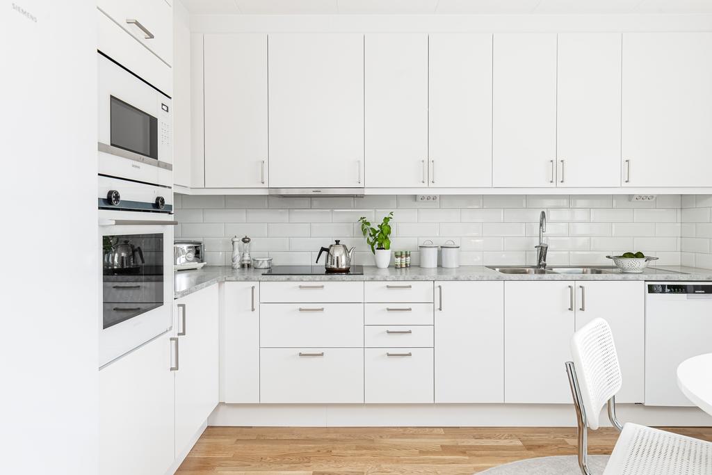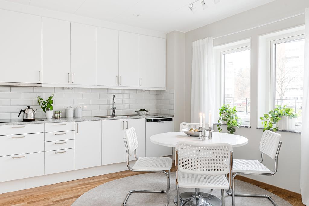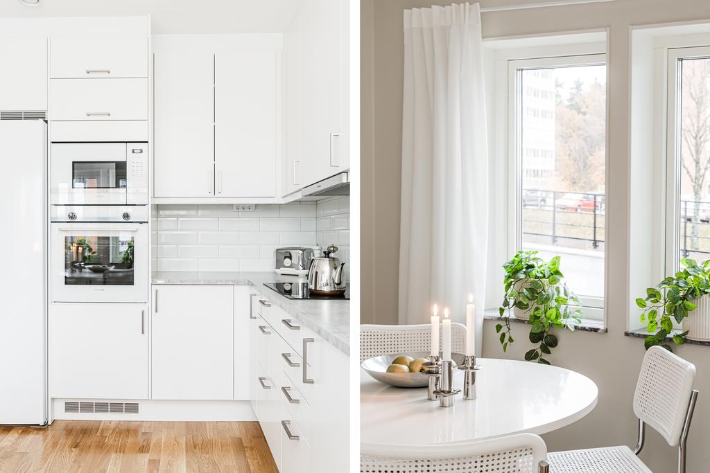 Köket är utformat i en trivsam vinkel med smakfull inredning, generösa arbetsytor och gott om förvaring. Här finns plats för en trevlig matgrupp vid fönstret – perfekt för både vardagsmiddagar och helgens långa frukostar.