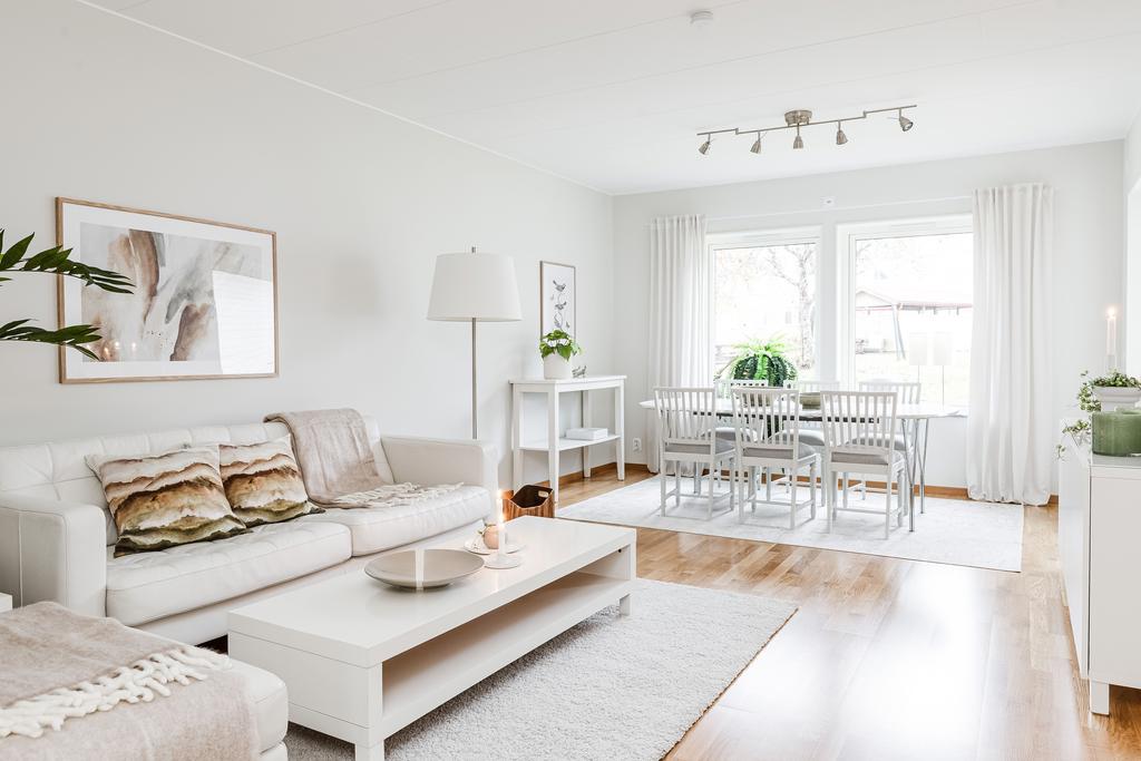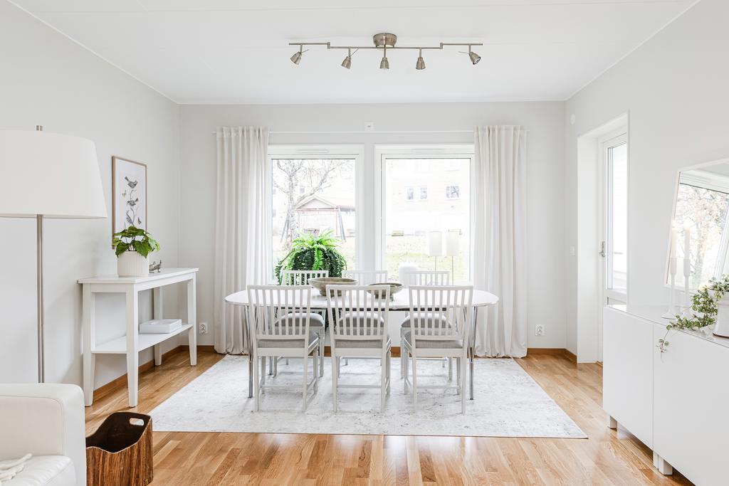 Vardagsrummet är ljust, luftigt och bjuder på en social yta med direkt kontakt till balkongen eller uteplatsen i soligt sydvästläge. Här kan du njuta av eftermiddagskaffet, läsa en bok eller bjuda in vänner till en somrig middag i grönskande omgivning.