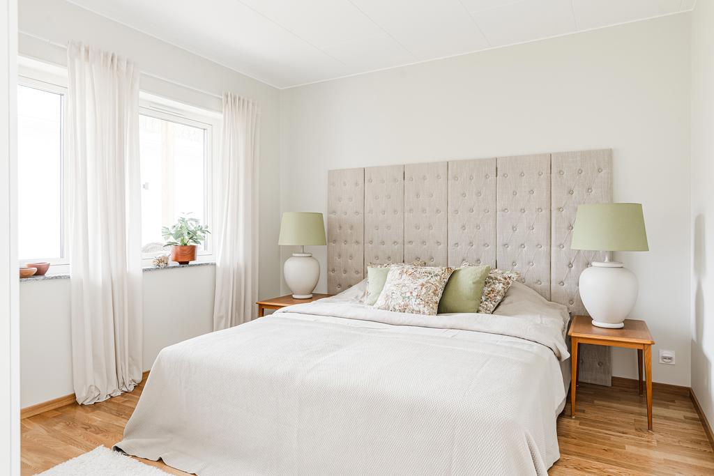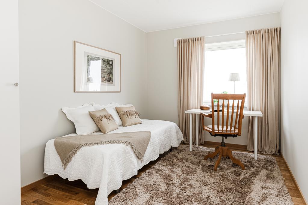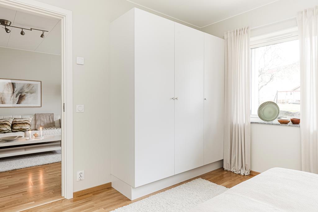 I direkt anslutning till köket ligger två sovrum – ett något större master bedroom med plats för dubbelsäng och garderober samt ett mindre sovrum som passar utmärkt som barnrum, gästrum eller arbetsrum.