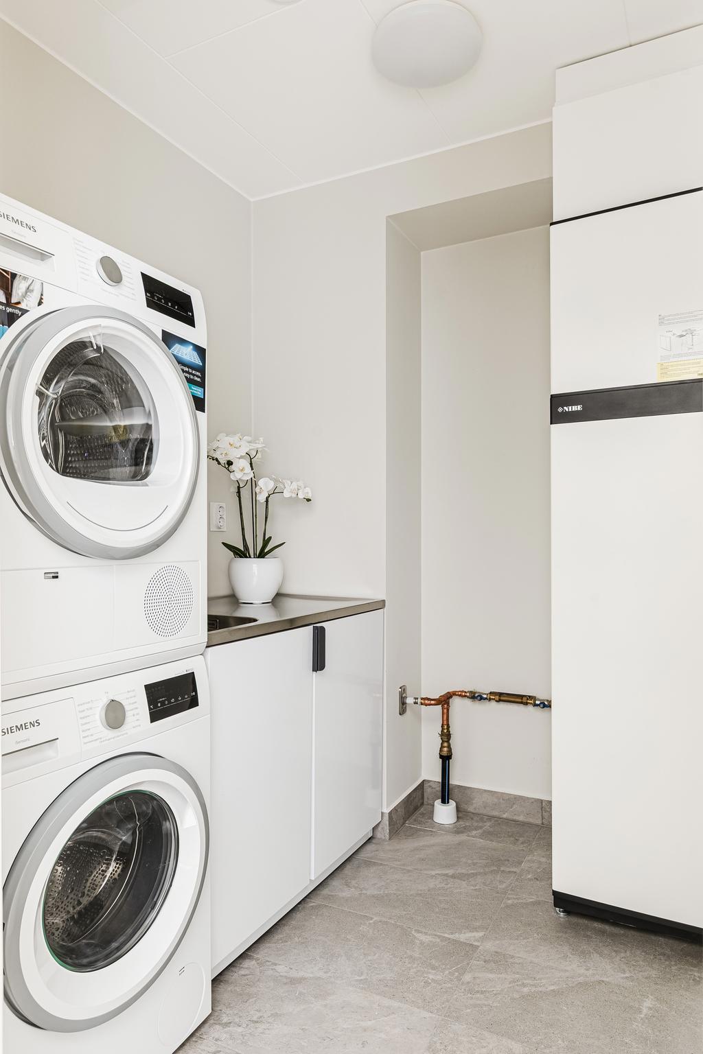 Tvättstugan är utrustad med tvättmaskin, torktumlare, bänkyta och gott om förvaring – allt för att skapa en funktionell och snygg arbetsmiljö.