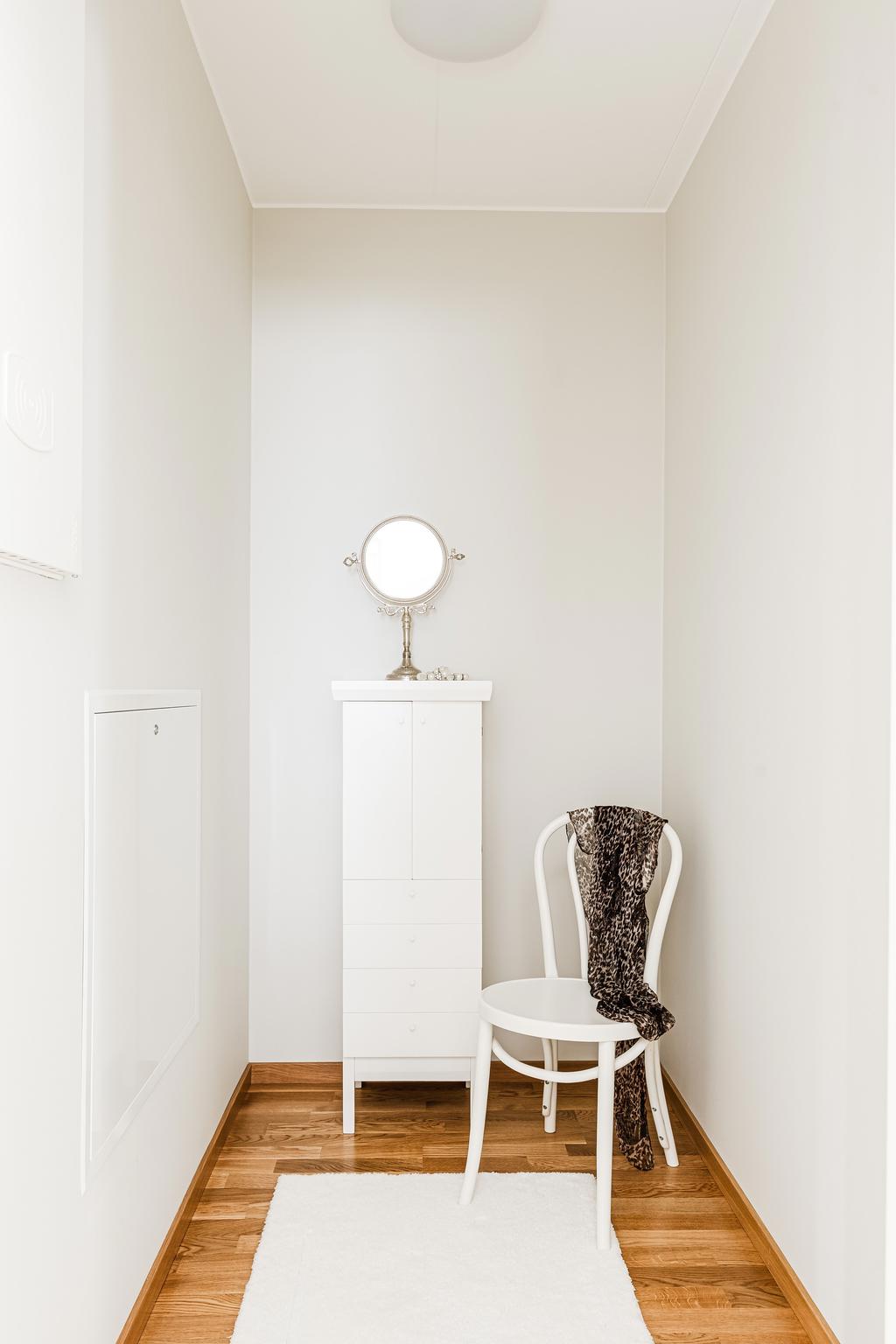 Hallen välkomnar med plats för ytterkläder och leder vidare till välplanerade utrymmen som tvättstuga, badrum och en rymlig klädkammare i fil.