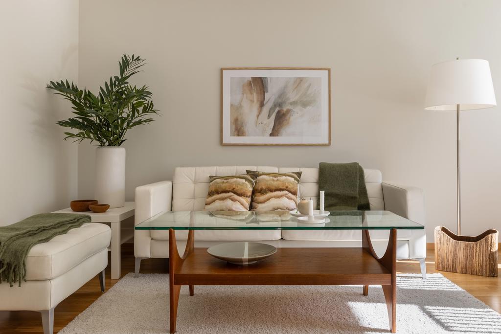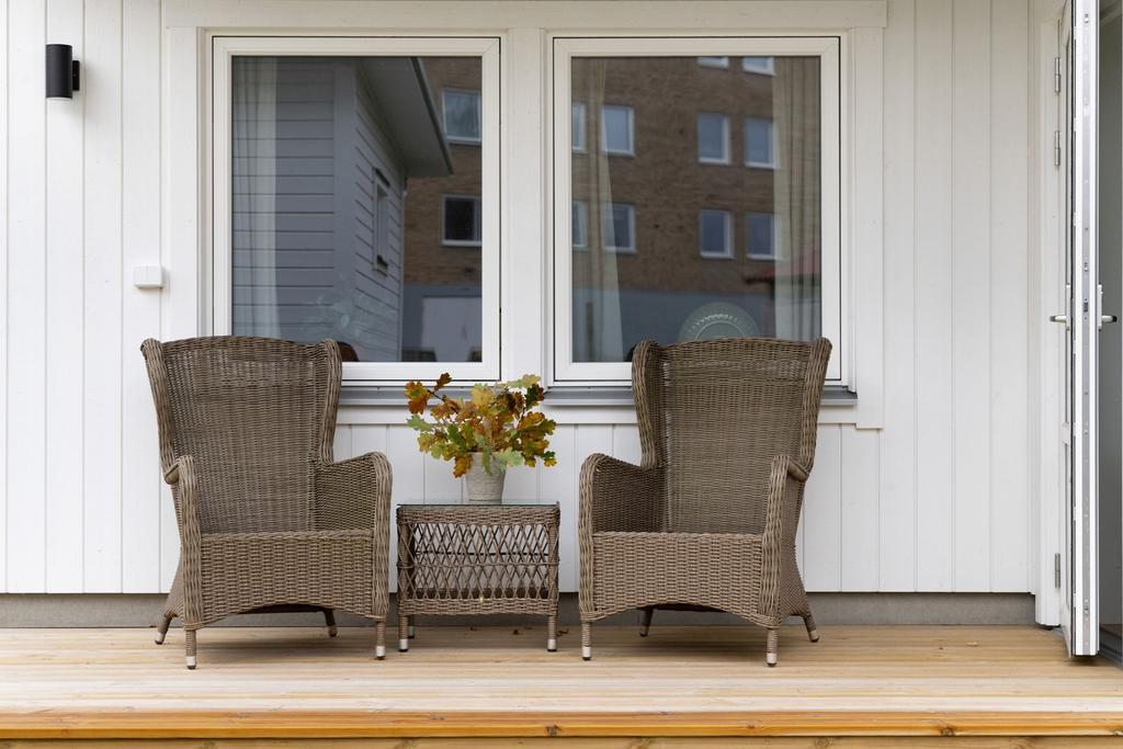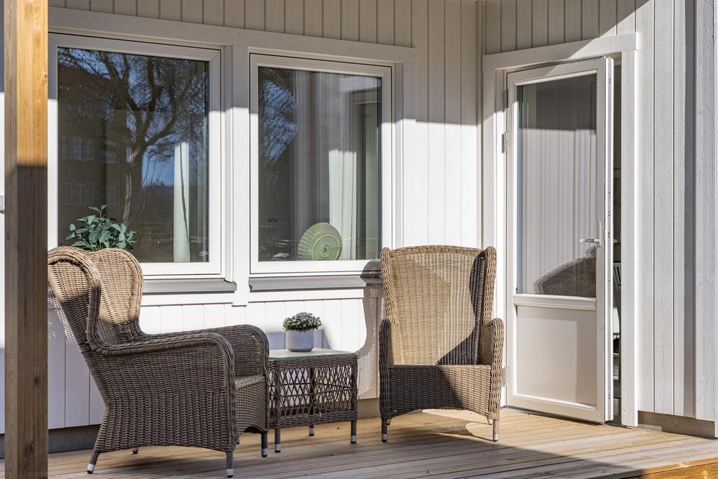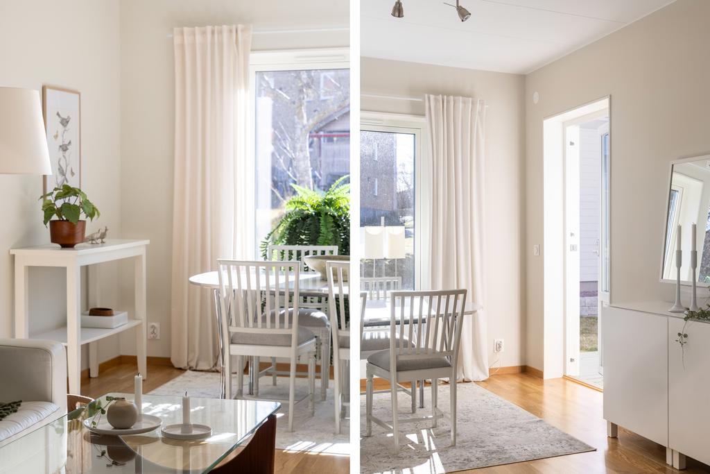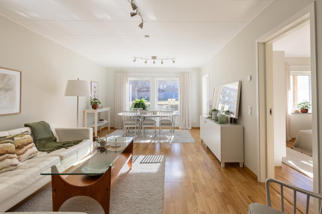 Vardagsrummet är ljust, luftigt och bjuder på en social yta med direkt kontakt till balkongen eller uteplatsen i soligt sydvästläge. Här kan du njuta av eftermiddagskaffet, läsa en bok eller bjuda in vänner till en somrig middag i grönskande omgivning.