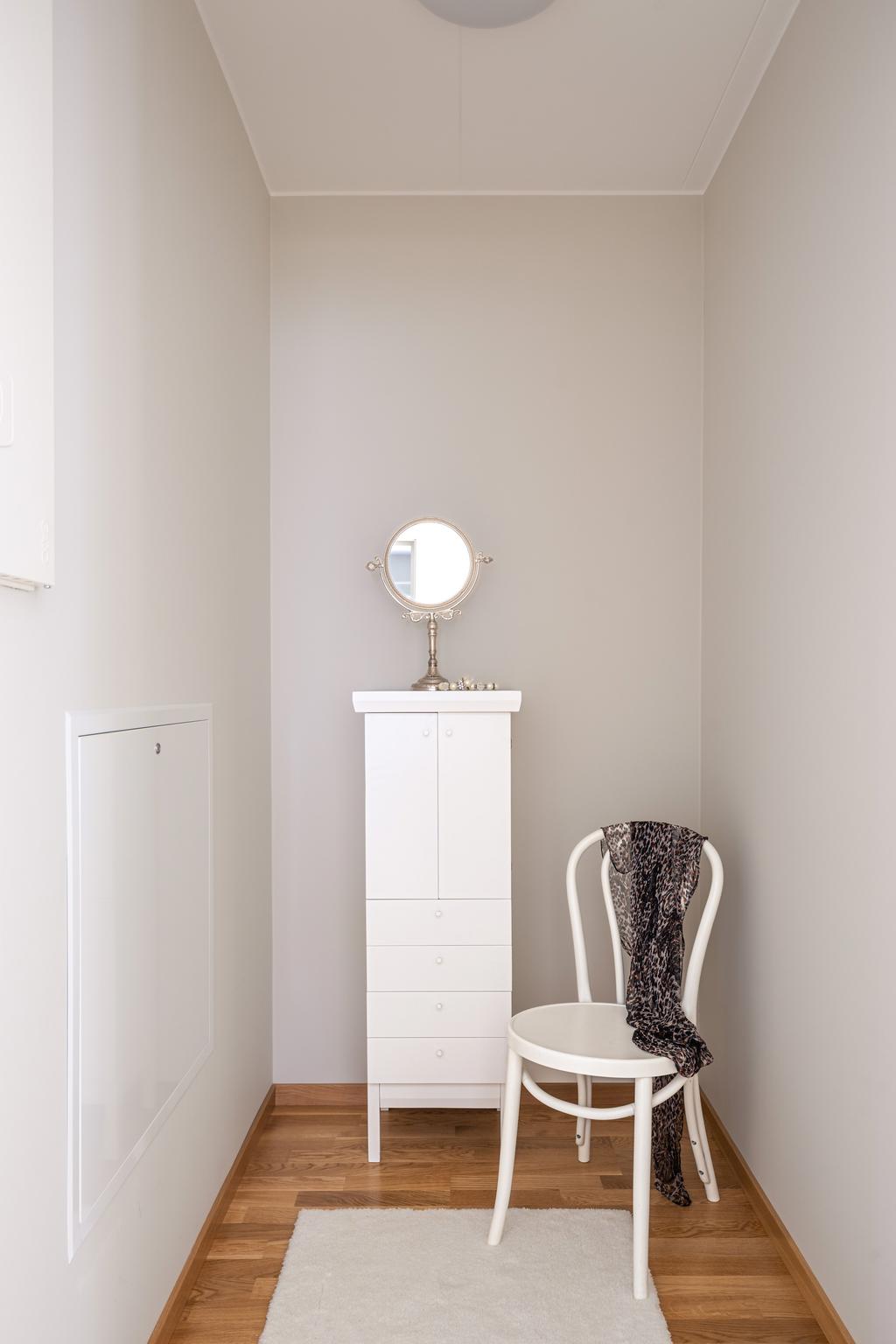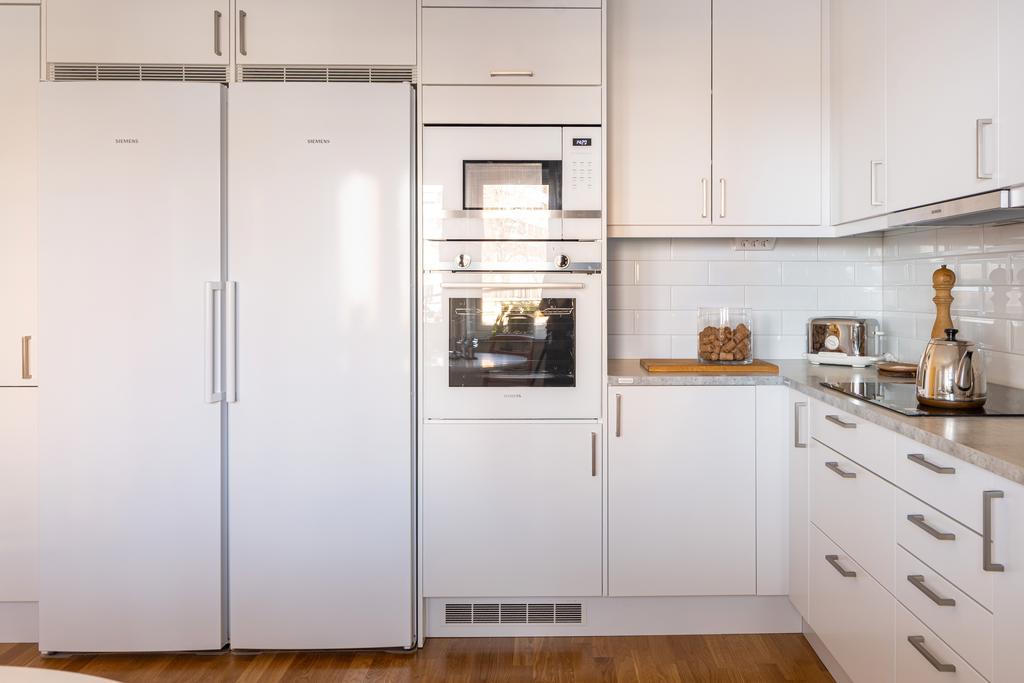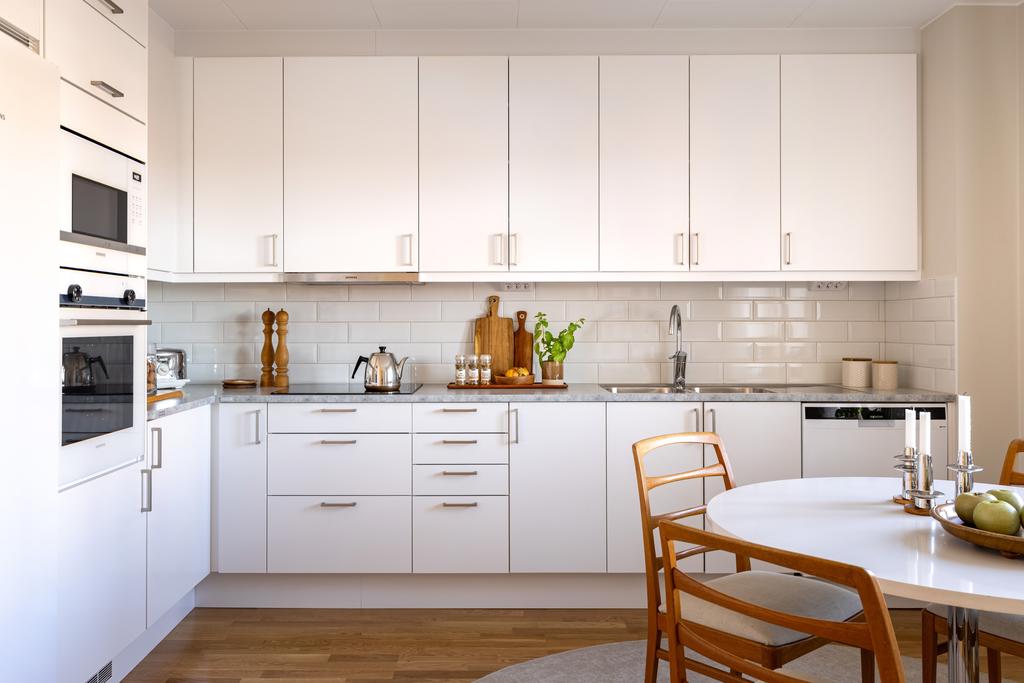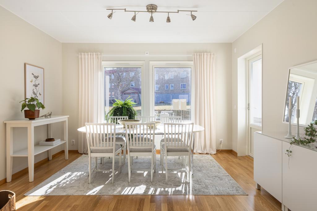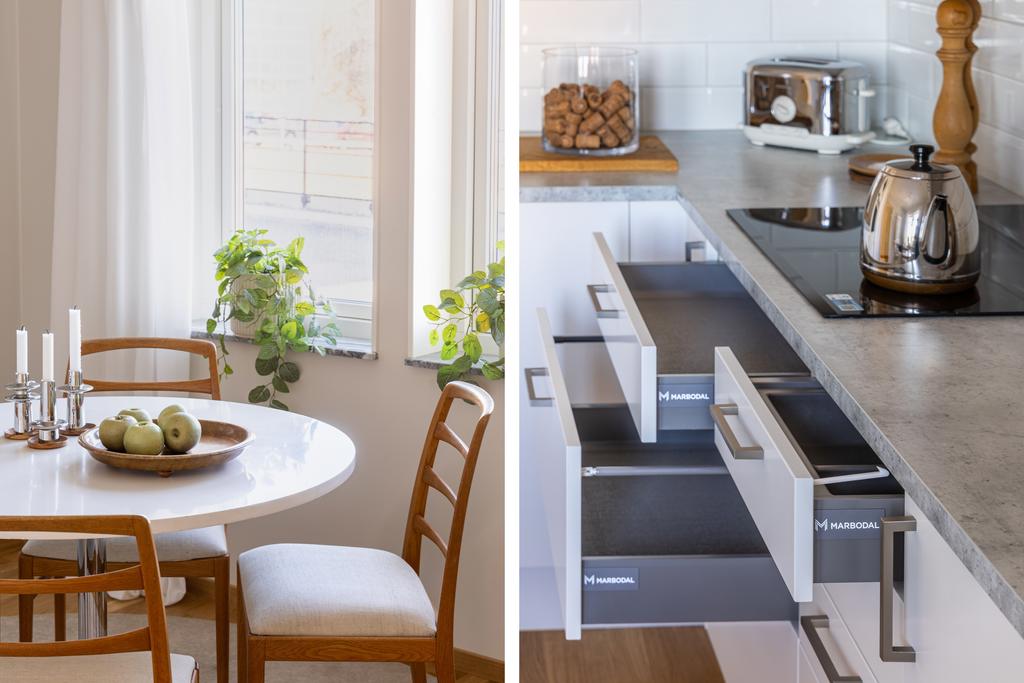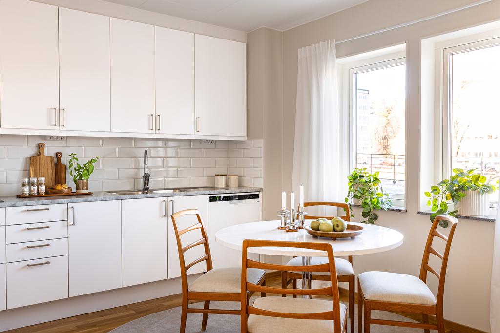 Köket är utformat i en trivsam vinkel med smakfull inredning, generösa arbetsytor och gott om förvaring. Här finns plats för en trevlig matgrupp vid fönstret – perfekt för både vardagsmiddagar och helgens långa frukostar.