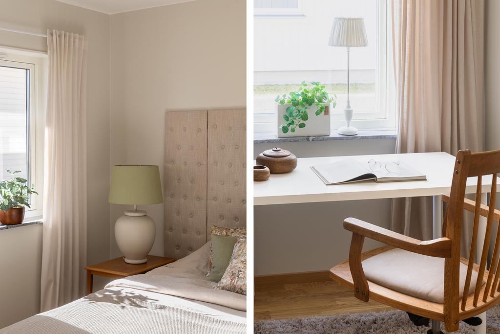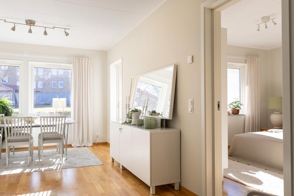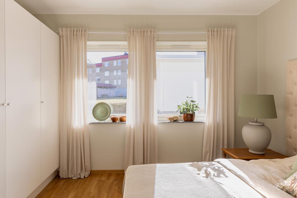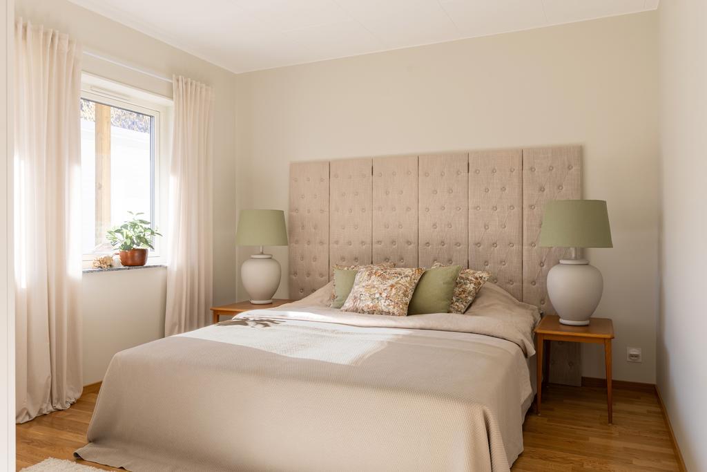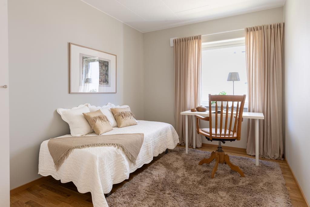 I direkt anslutning till köket ligger två sovrum – ett något större master bedroom med plats för dubbelsäng och garderober samt ett mindre sovrum som passar utmärkt som barnrum, gästrum eller arbetsrum.