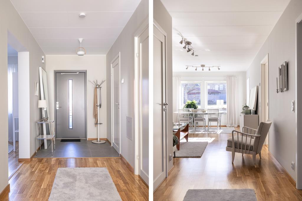 Hallen välkomnar med plats för ytterkläder och leder vidare till välplanerade utrymmen som tvättstuga, badrum och en rymlig klädkammare i fil.
