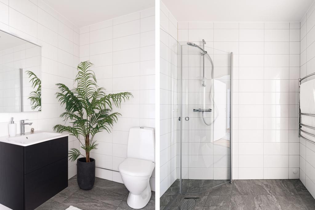 Badrummet är helkaklat med klinkergolv, dusch och kommod.