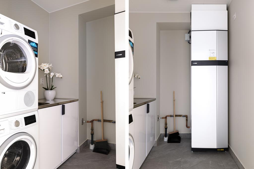 Tvättstugan är utrustad med tvättmaskin, torktumlare, bänkyta och gott om förvaring – allt för att skapa en funktionell och snygg arbetsmiljö.