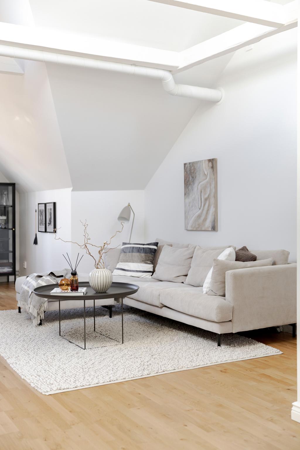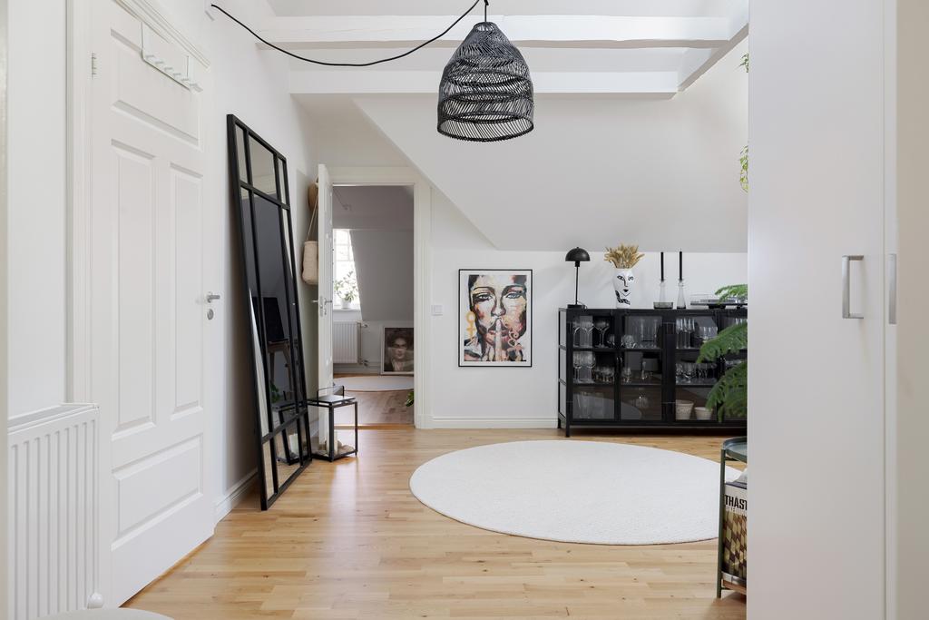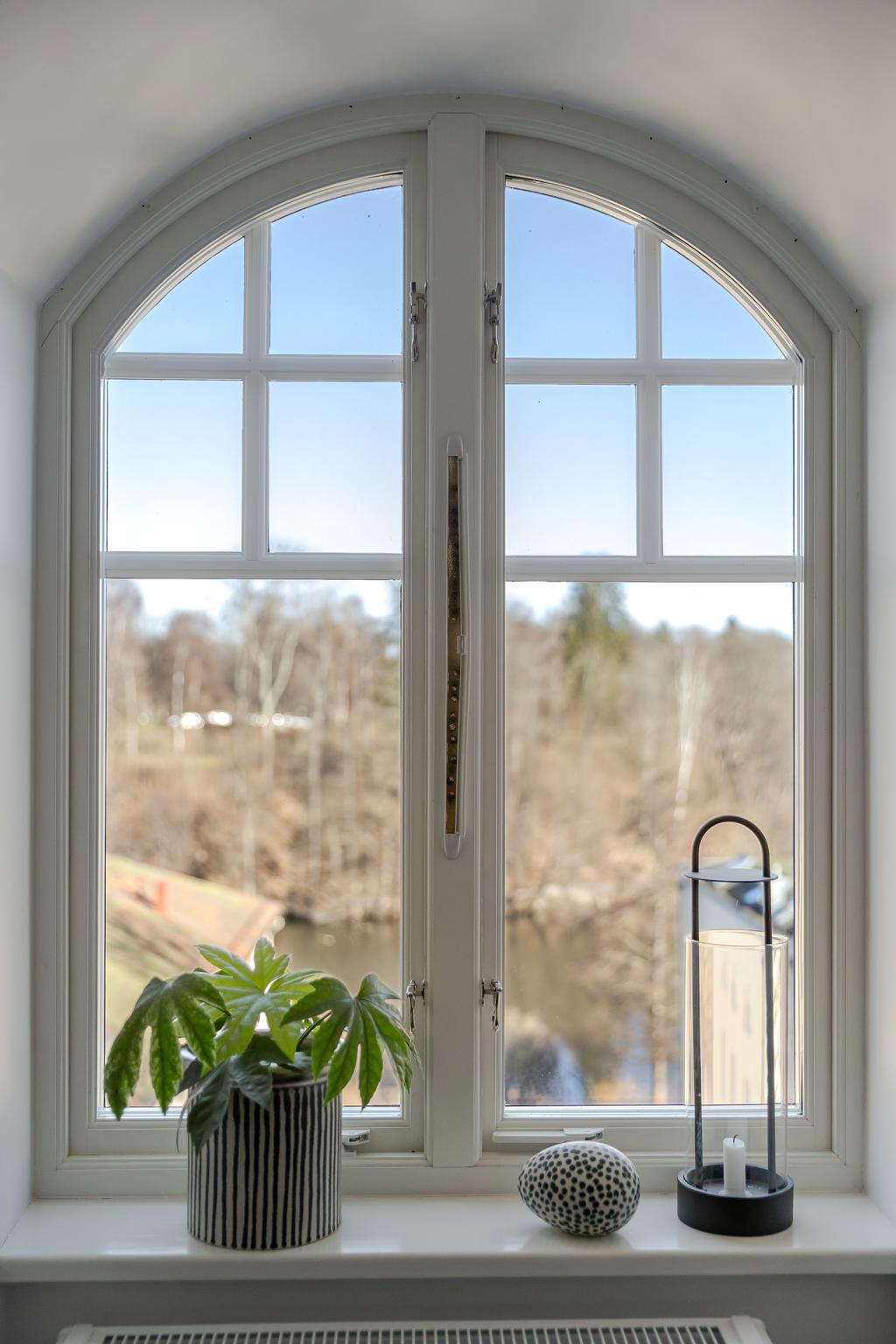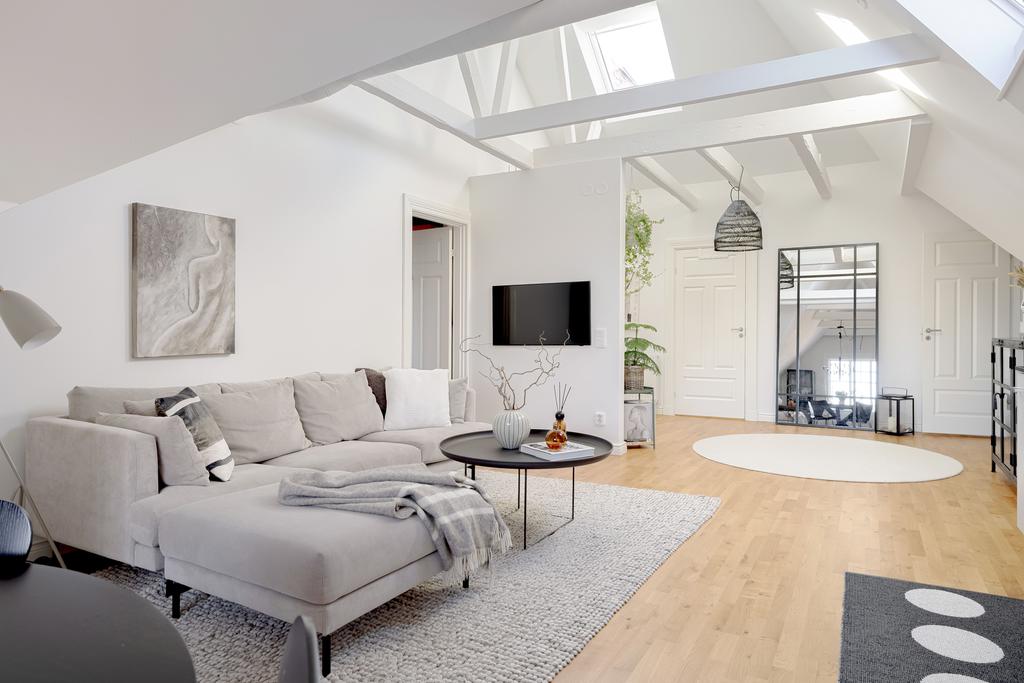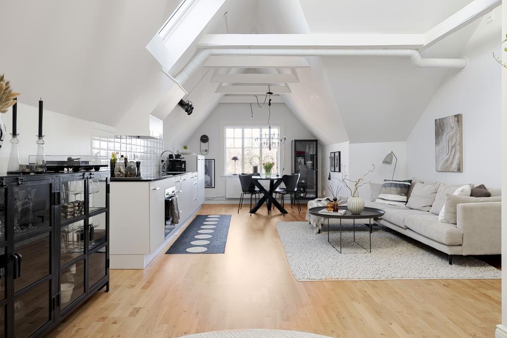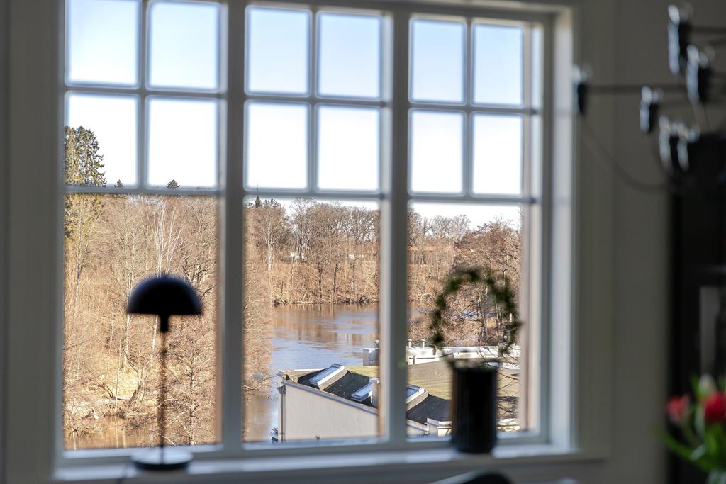 Elegant vindslägenhet med takbjälkar och utsikt över Motala ström!