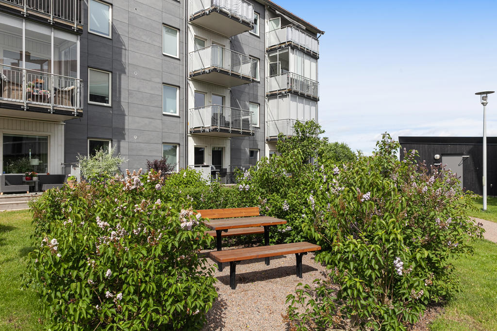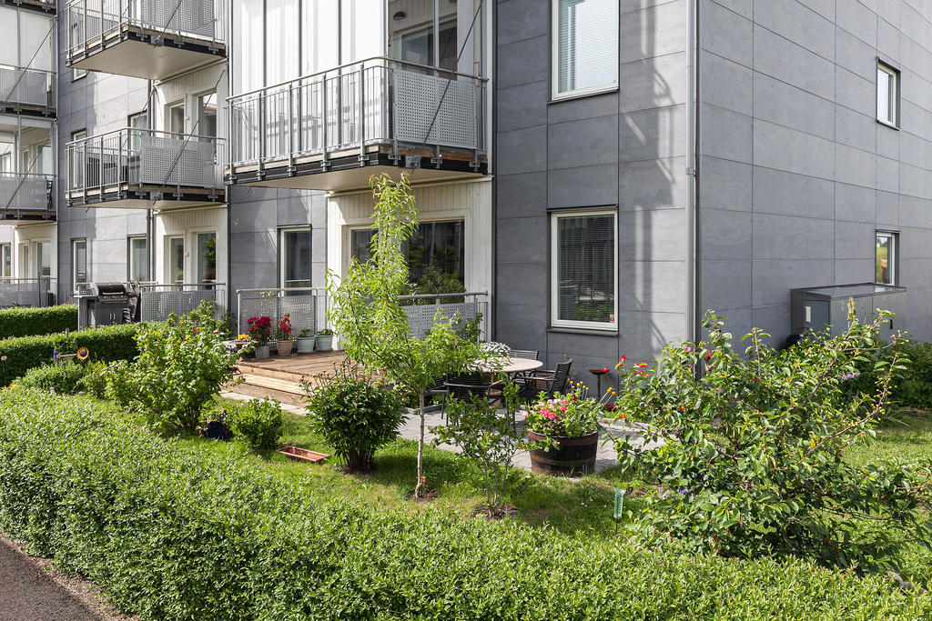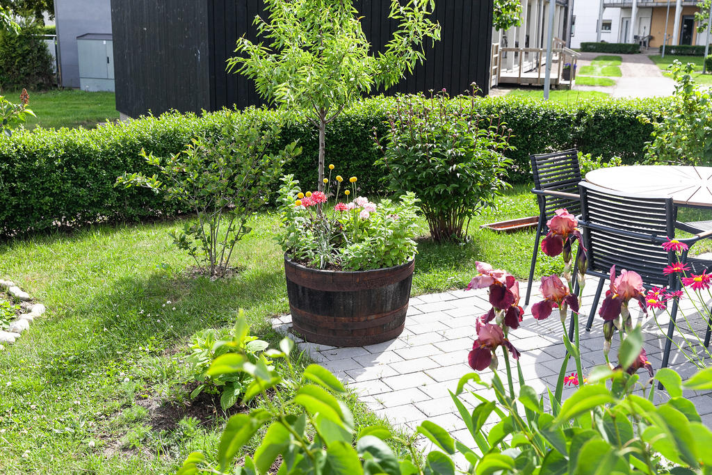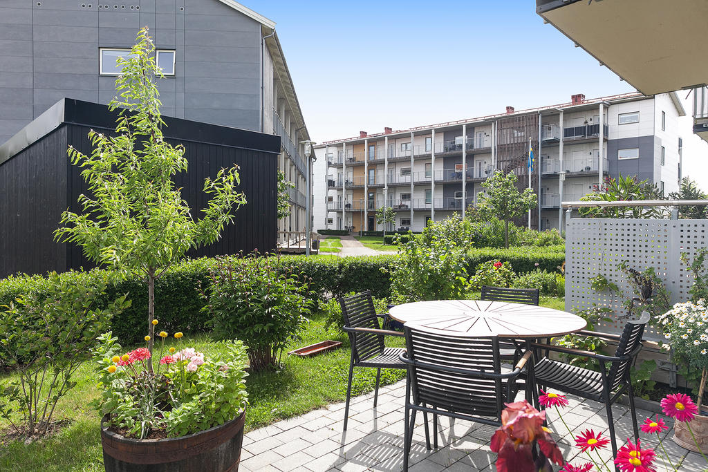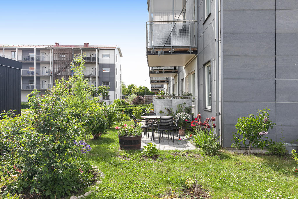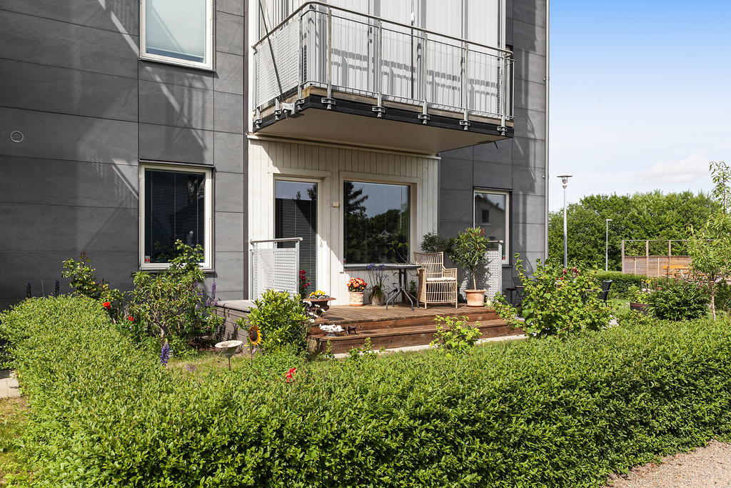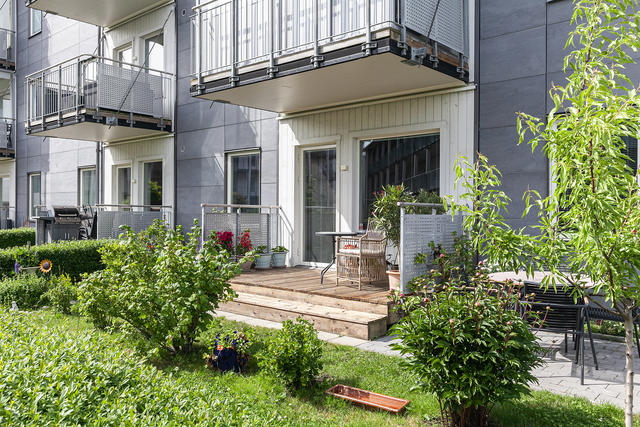 Ljus och välplanerad hörnlägenhet med generös uteplats och egen trädgård