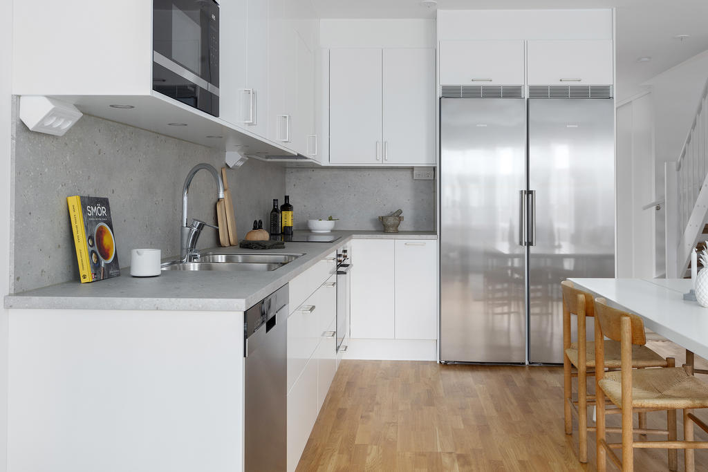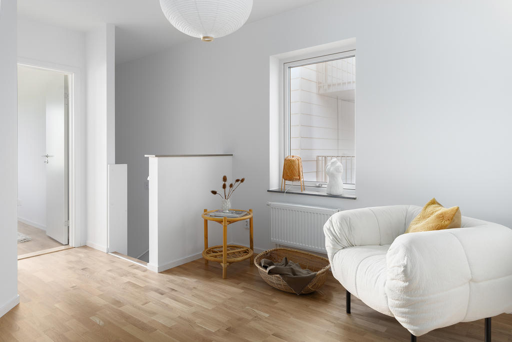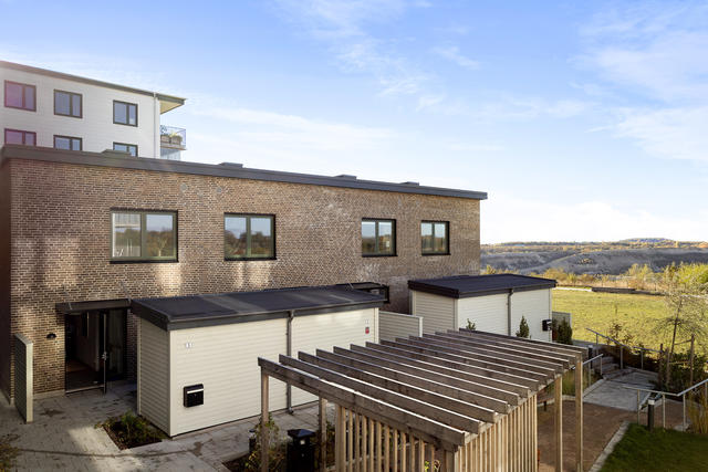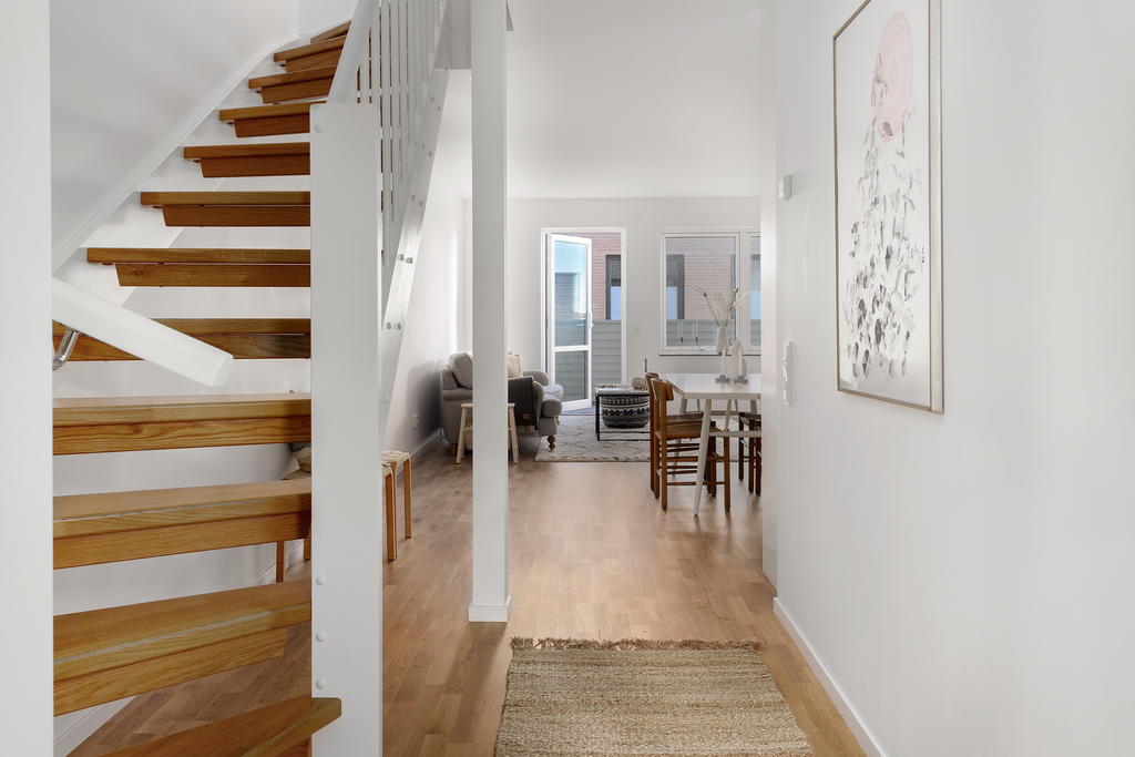 Välplanerat gavelradhus på två våningar med öppen planlösning och dubbla uteplatser