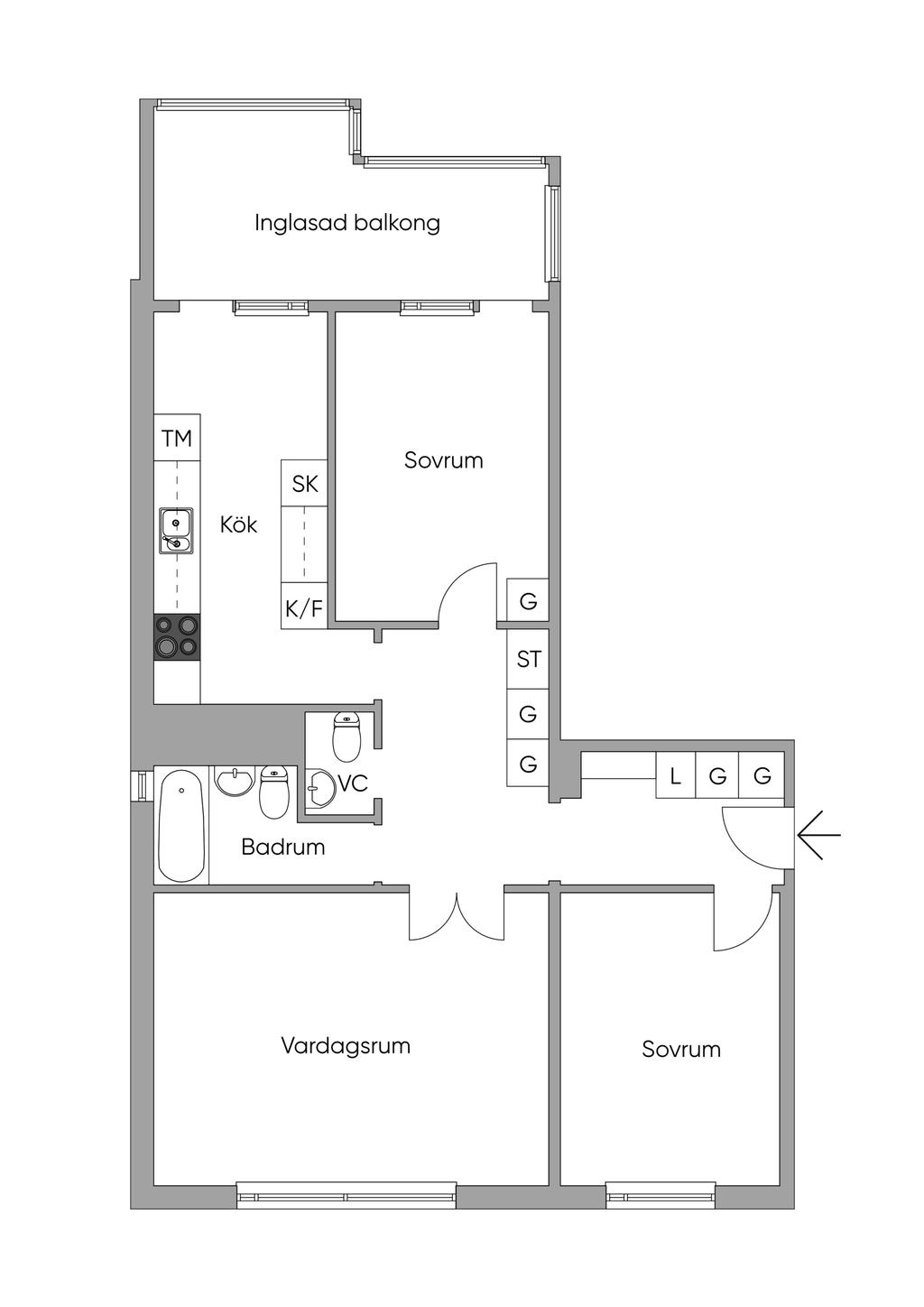 Välplanerad 3:a med badrum, gäst-WC och inglasad balkong