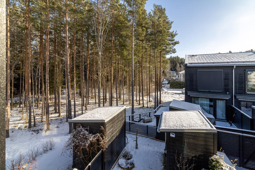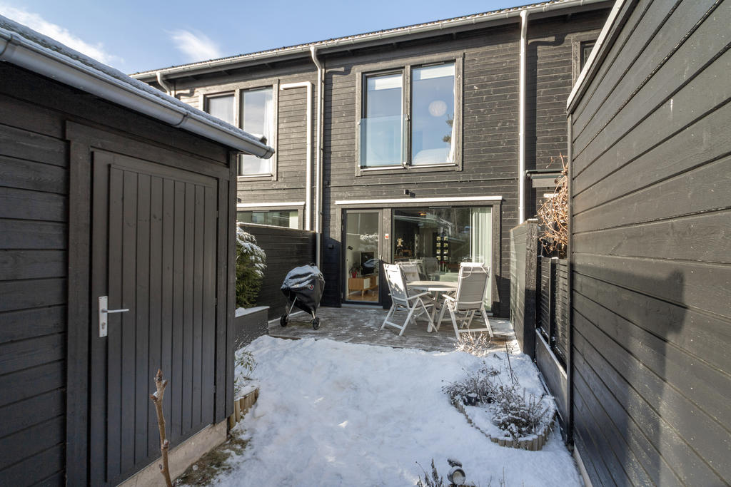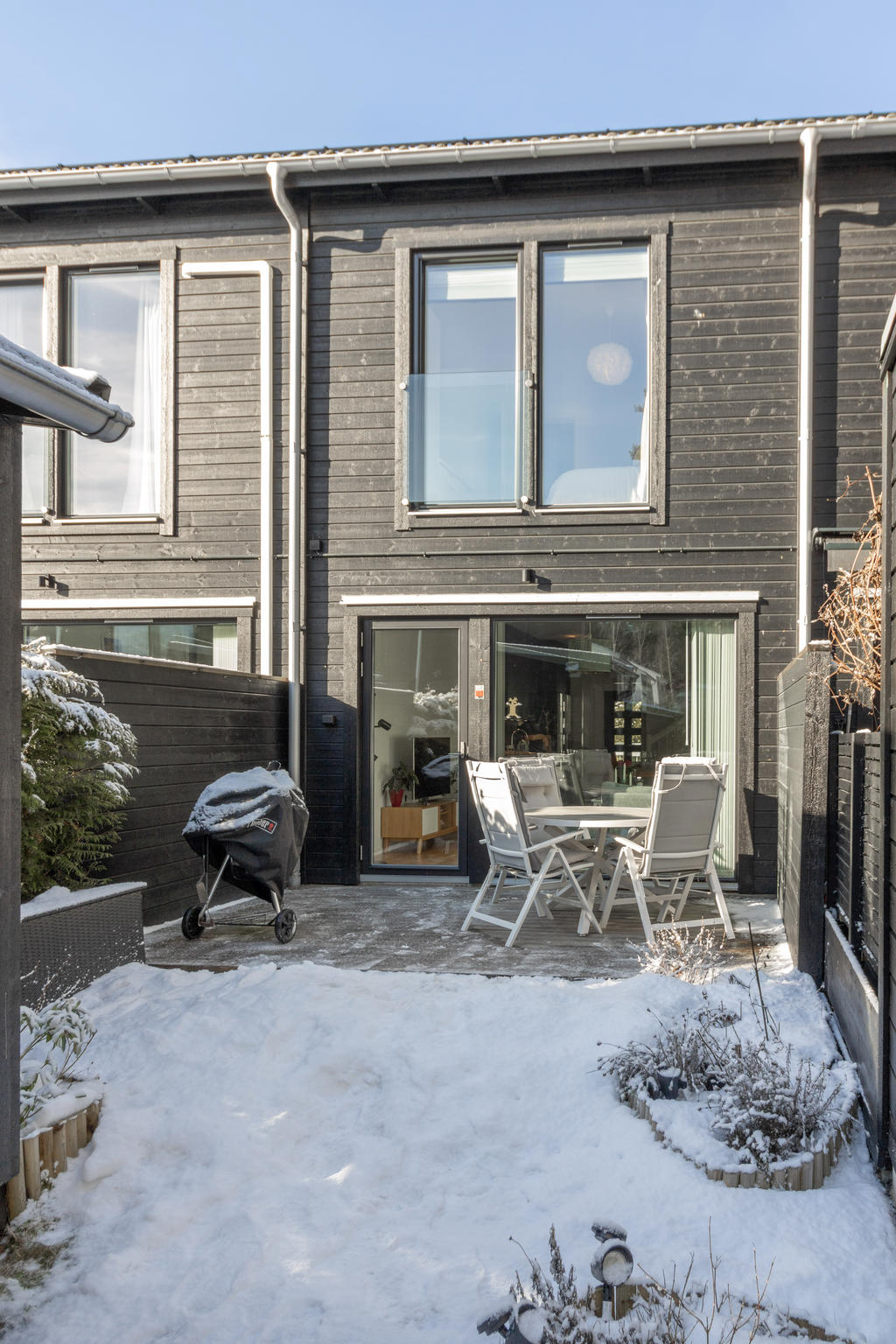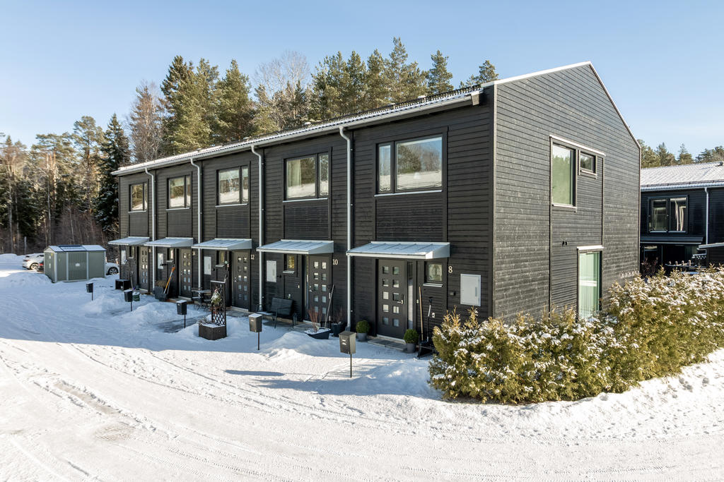 Såväl interiört som exteriört präglas de svarta radhusen från 2017 av en grafiskt stilren design och dess generösa glaspartier. Planlösningen är öppen och ljus, materialvalen påkostade och läget insynsskyddat med vackert utsikt över skogsbacken intill. Ett lättskött och bekvämt boende med bostadsrättsformat, 3 rum och kök om 87 m², i natursköna Borsökna!