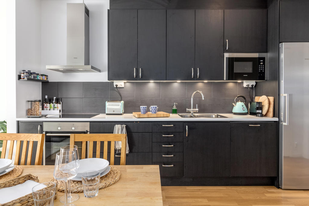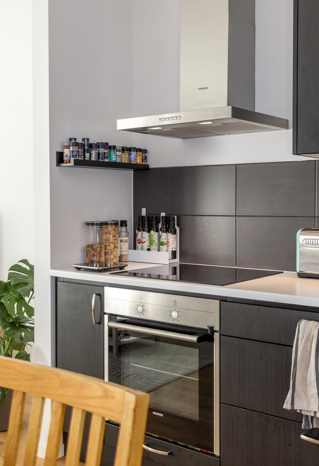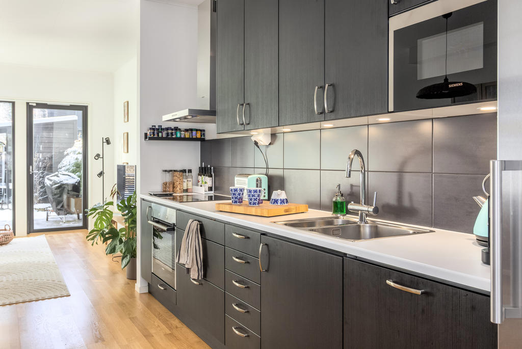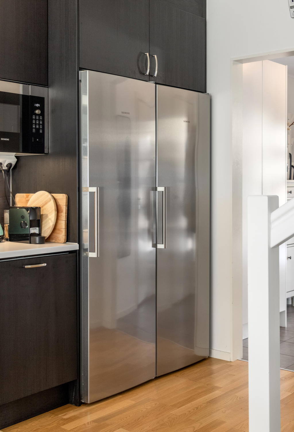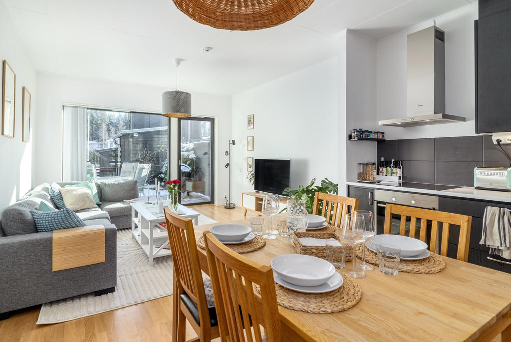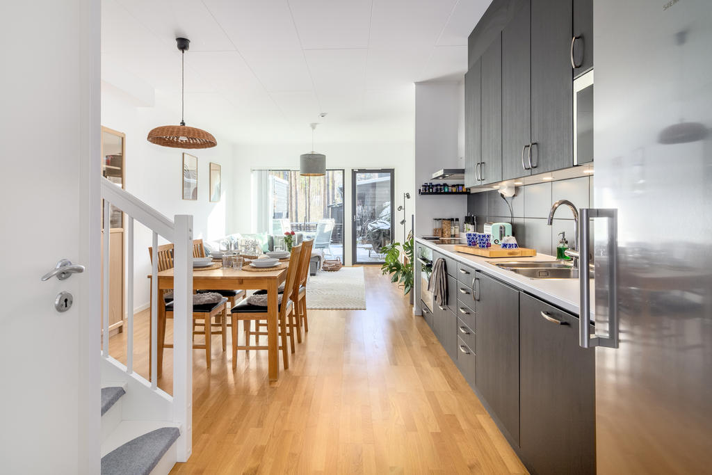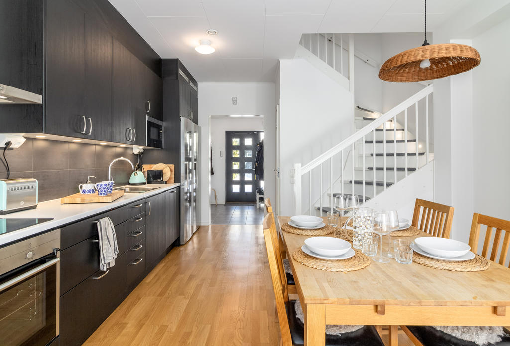Rakt fram öppnar planlösningen upp mot husets sociala ytor som knyts ihop av enhetliga parkettgolv och ljusa målade väggar. I öppen planlösning möter det svarta köket en rejäl matplats och vardagsrum. I stor sett hela gaveln på vardagsrummet är ett glasparti mot den insynsskyddade trädgården på baksidan. Kökets svarta luckor och svarta kakel bryts av med vit bänkskiva och inbyggda vitvaror i rostfritt. Den öppna planlösningen ger möjlighet att duka långbord som rymmer både släkt och vänner under årets fester. Från altandörren nås en helt insynsskyddad liten trädgård med altandäck, odlingslådor och ett förråd för cyklar och trädgårdsredskap. Baksidans trädgård angränsar till en skogsbacke som på våren färgas vit av vitsippor och senare bjuder den på både blåbär och svamp till höstens lyxtoast.