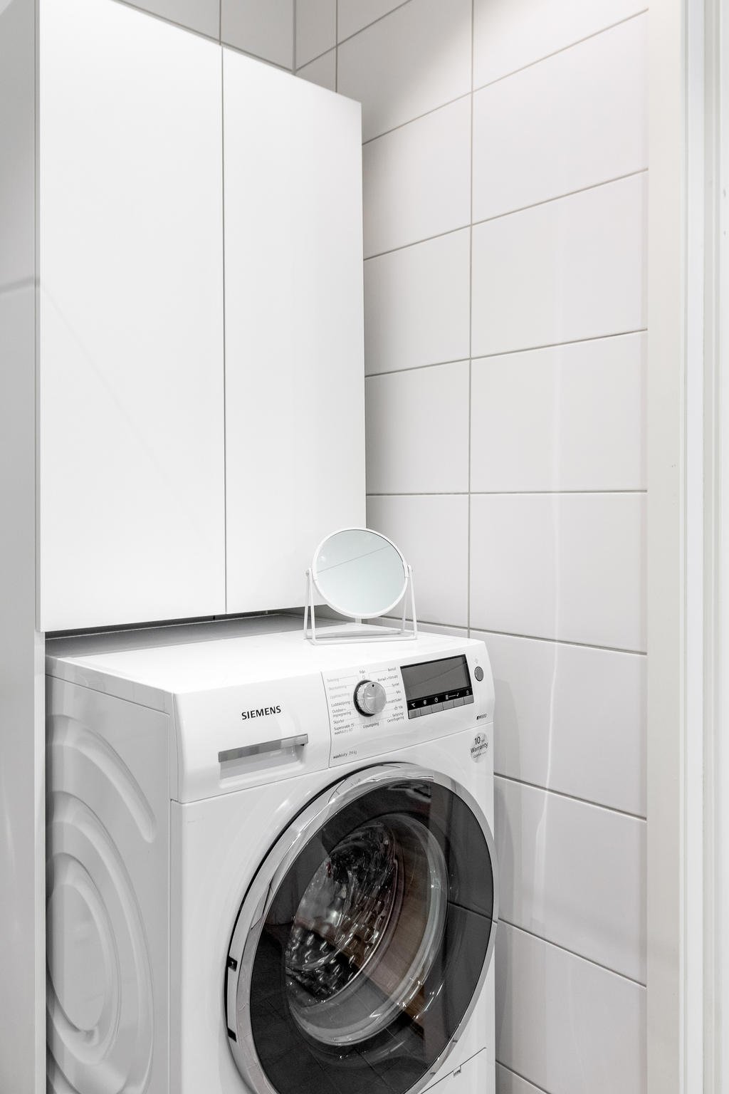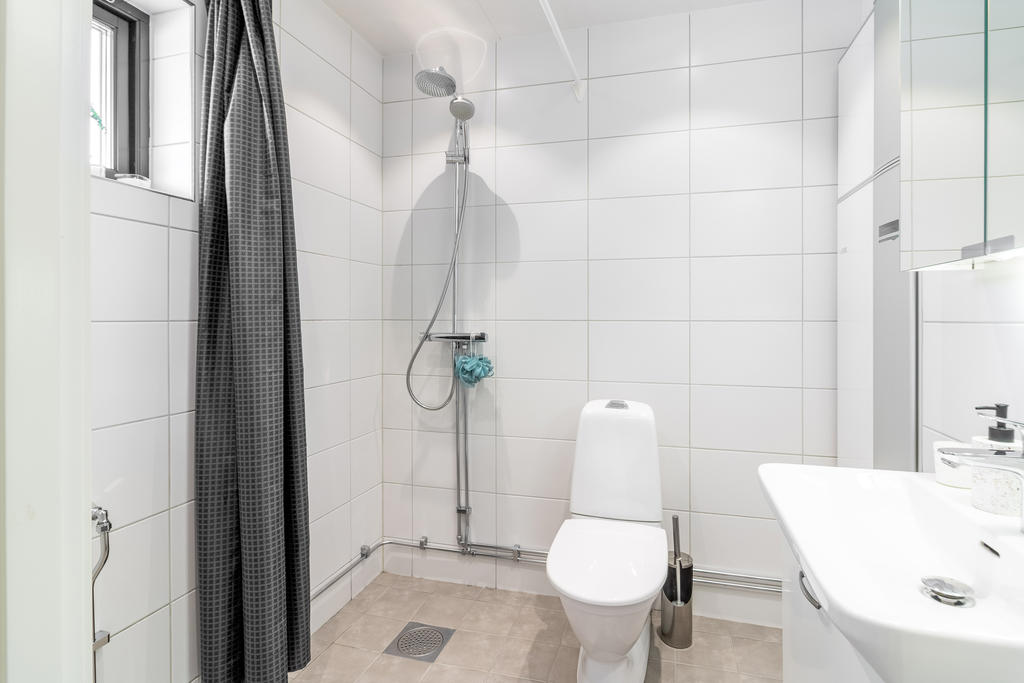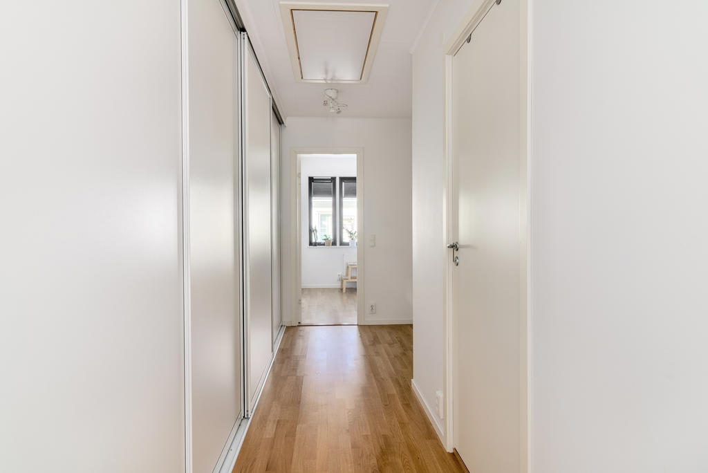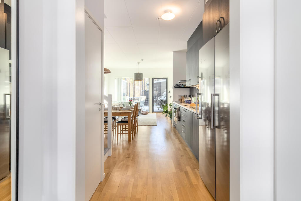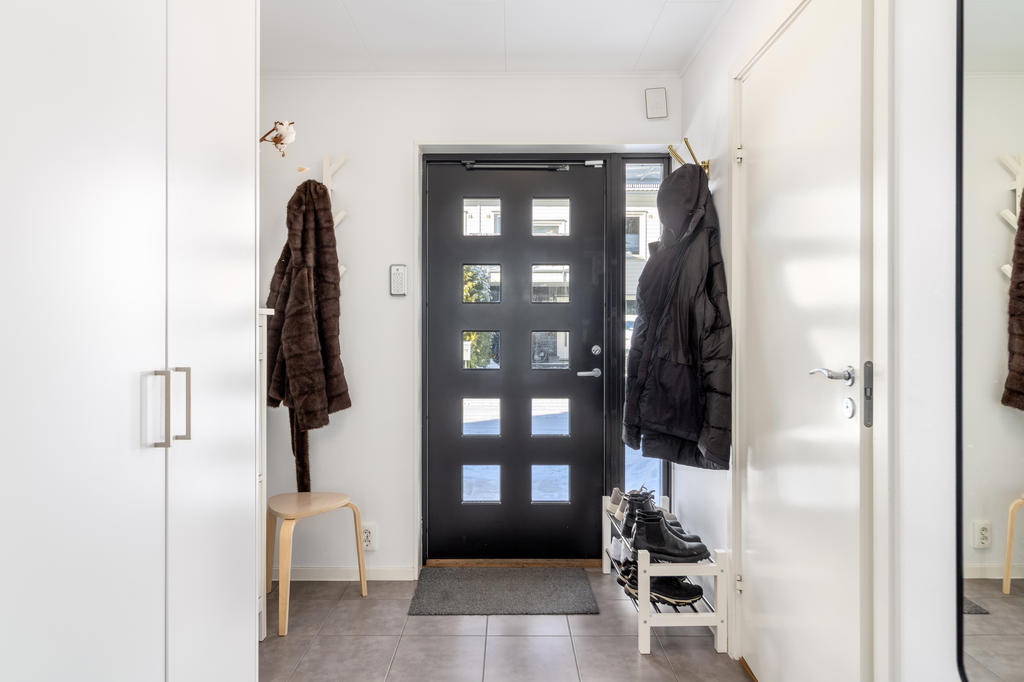 Runt hörnet från det gemensamma parkeringen nås framsidans stenlagda uppfart. Här finns utrymme att parkera familjens cyklar och från det lilla cafésetet har man perfekt uppsikt över barnens första vingliga cykelturer på den korta återvändsgatan. Den takade entrén leder till en öppen och ljus hall. Dörrens 10 små glasrutor och sidoljuset intill ger ett naturligt ljus och djup åt den öppna planlösningen. På golvet ligger ett grått klinkergolv och det finns utrymme för ytterkläder och skor i garderober samt krokar på väggen. Här finns även ett stilrent helkaklat badrum med dusch.