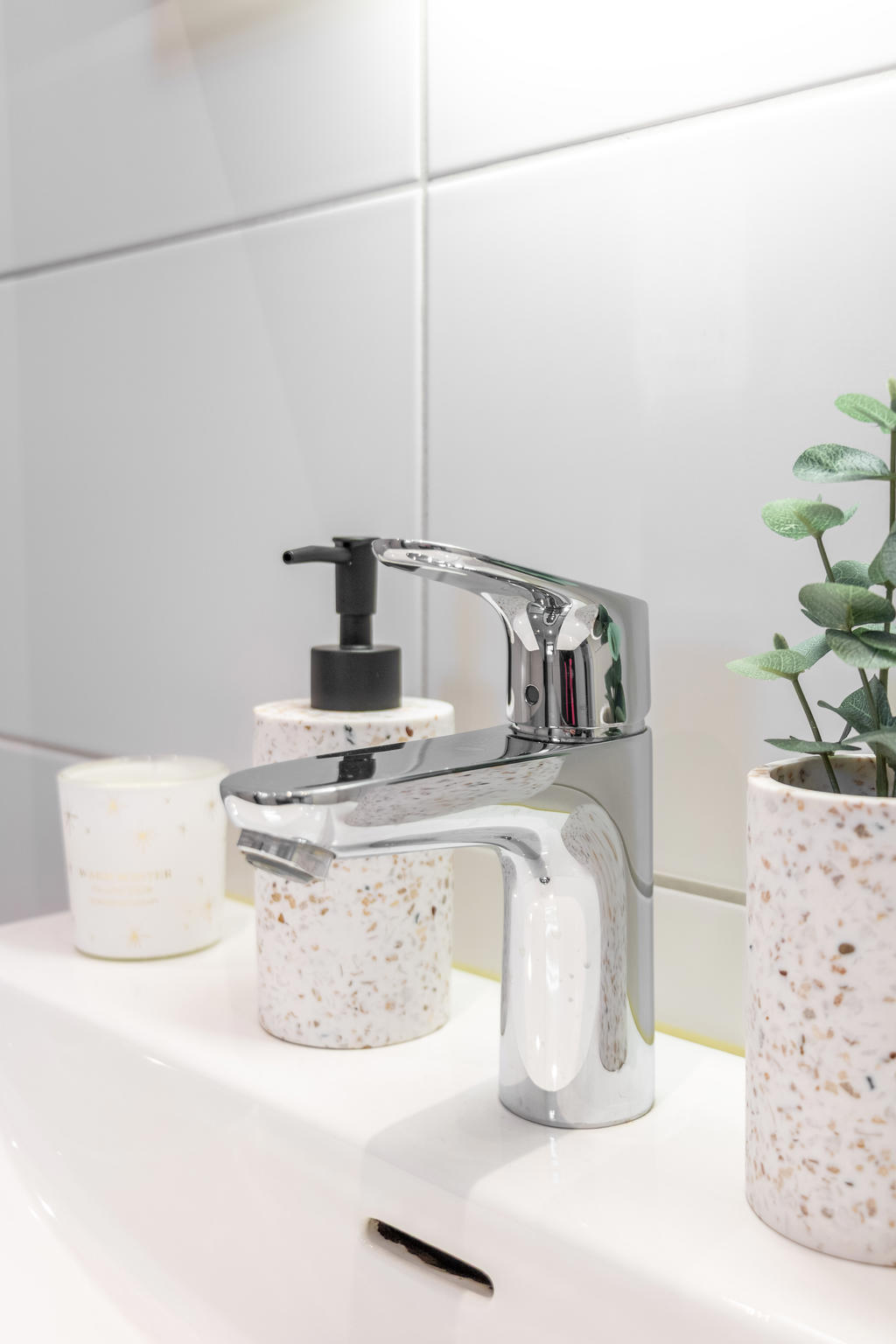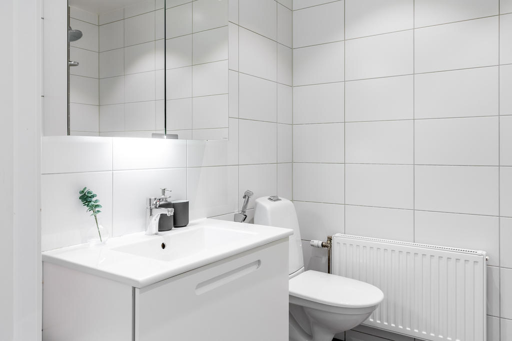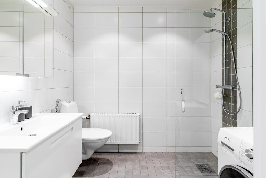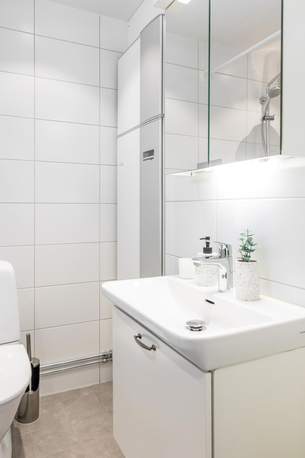 Runt hörnet från det gemensamma parkeringen nås framsidans stenlagda uppfart. Här finns utrymme att parkera familjens cyklar och från det lilla cafésetet har man perfekt uppsikt över barnens första vingliga cykelturer på den korta återvändsgatan. Den takade entrén leder till en öppen och ljus hall. Dörrens 10 små glasrutor och sidoljuset intill ger ett naturligt ljus och djup åt den öppna planlösningen. På golvet ligger ett grått klinkergolv och det finns utrymme för ytterkläder och skor i garderober samt krokar på väggen. Här finns även ett stilrent helkaklat badrum med dusch.