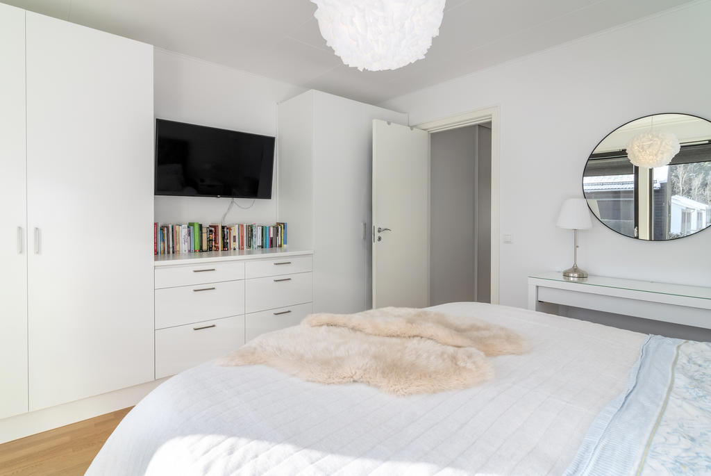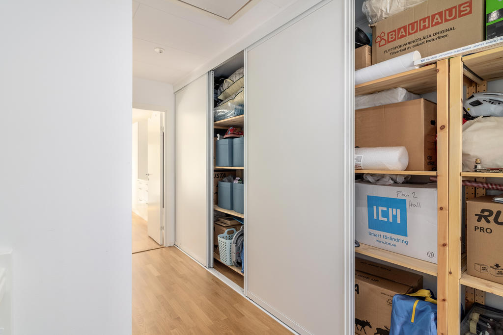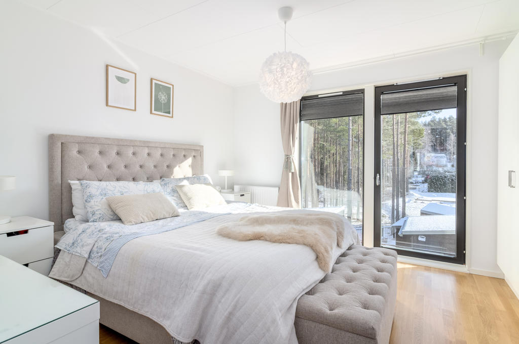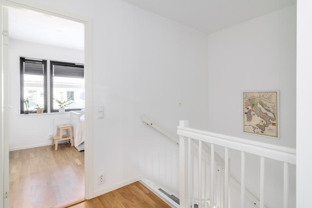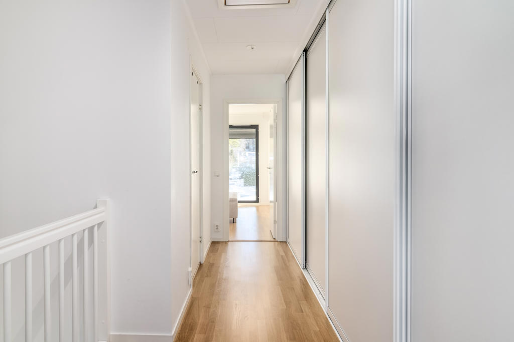 Den vita svängda trappen har effektfull belysning och leder upp till huset privata avdelning. Här finns två sovrum, ett till helkaklat badrum med kombinerad tvättmaskin/torktumlare och dusch samt gott om förvaringsutrymmen. Hela långsidan av hallen är en enda stor garderobslösning och härifrån nås även vindsutrymmet. Det större sovrummet har 2 rejäla garderober med måttanpassad klädbyrå emellan. Rummet har ett stort glasparti och fransk balkong mot skogen. Lägg märke till den franska balkongens räcke, en diskret design i helglas. Härifrån kan man spana på alla rådjur och harar som kommer på besök i skogskanten. Det mindre sovrummet har förvaring i 4 st garderober.