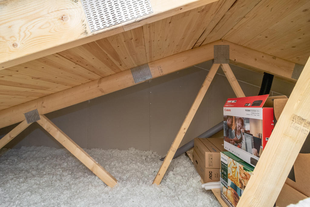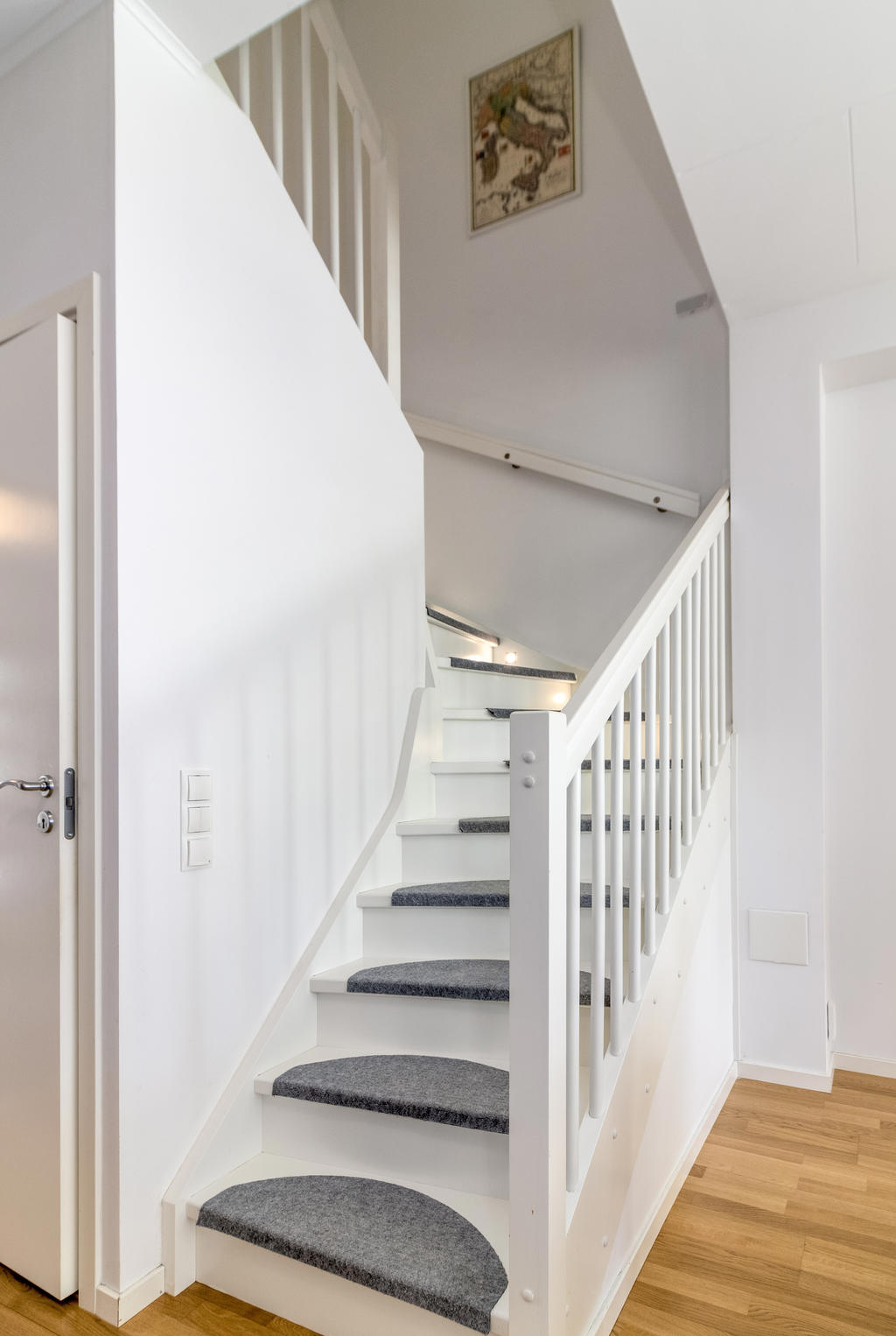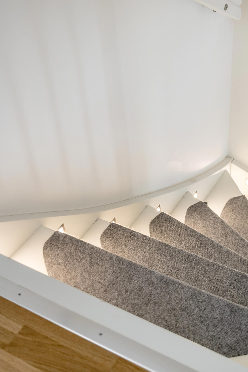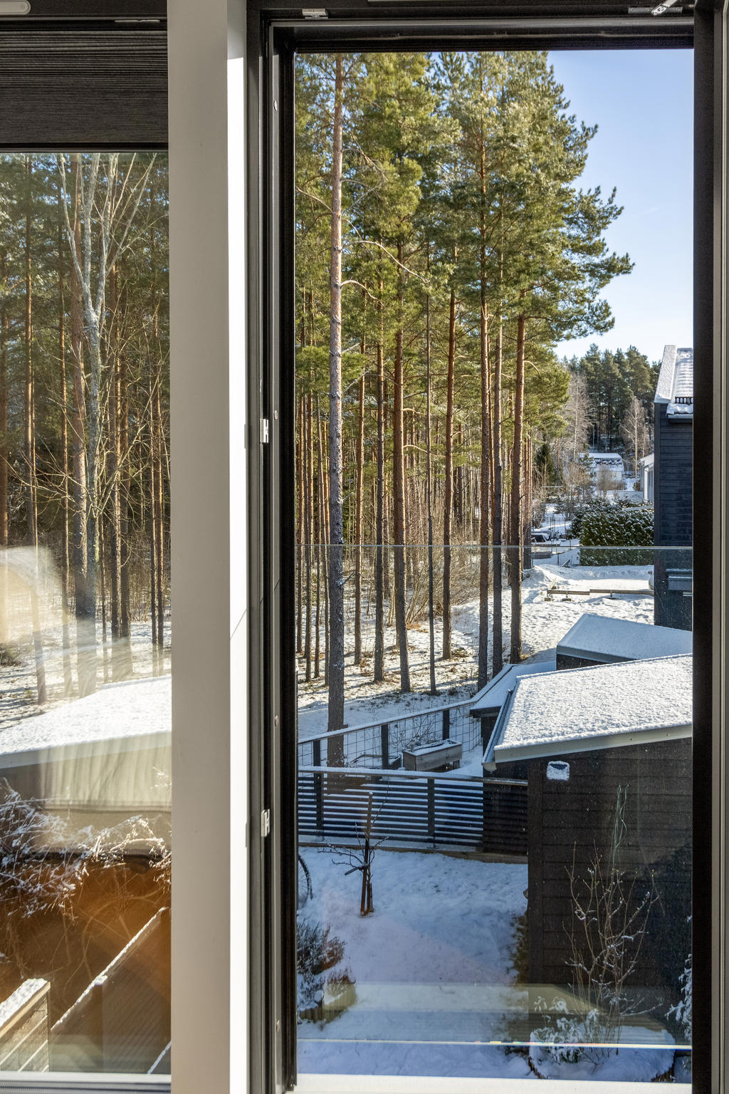 Den vita svängda trappen har effektfull belysning och leder upp till huset privata avdelning. Här finns två sovrum, ett till helkaklat badrum med kombinerad tvättmaskin/torktumlare och dusch samt gott om förvaringsutrymmen. Hela långsidan av hallen är en enda stor garderobslösning och härifrån nås även vindsutrymmet. Det större sovrummet har 2 rejäla garderober med måttanpassad klädbyrå emellan. Rummet har ett stort glasparti och fransk balkong mot skogen. Lägg märke till den franska balkongens räcke, en diskret design i helglas. Härifrån kan man spana på alla rådjur och harar som kommer på besök i skogskanten. Det mindre sovrummet har förvaring i 4 st garderober.