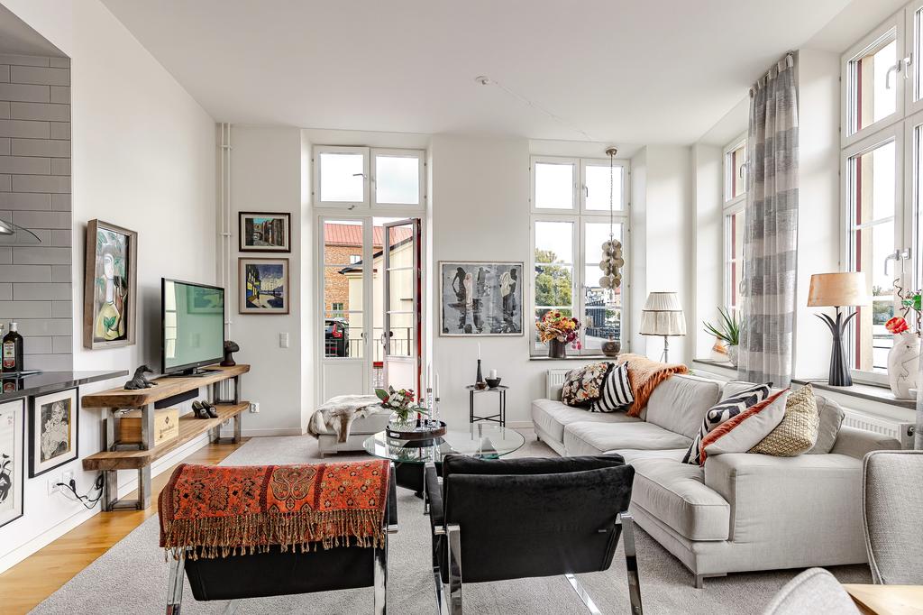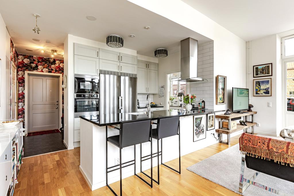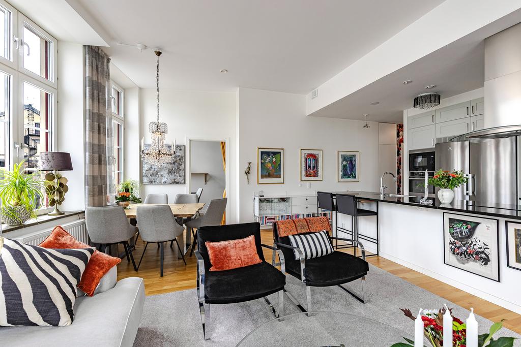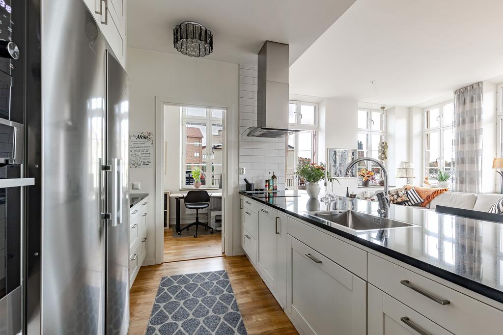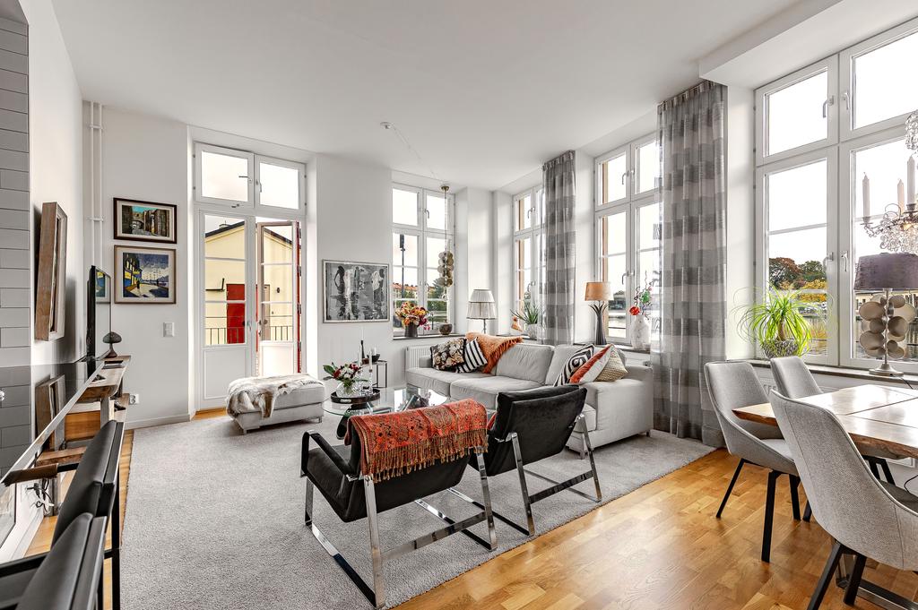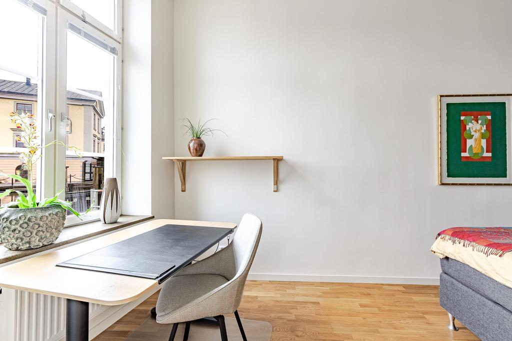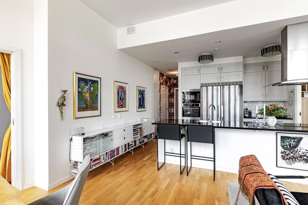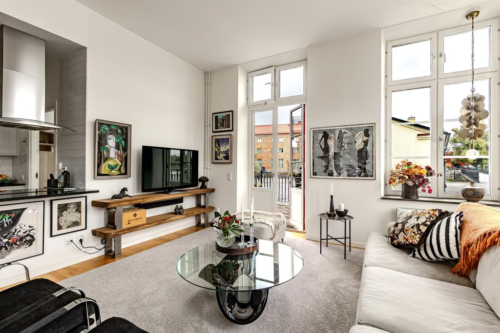 Redan i entréhallen anas bostadens karaktär och rymd. Rakt fram möts man av sociala ytor med kök och vardagsrum i öppen planlösning och hela 3,2 m i takhöjd. De höga spröjsade fönstren, som domineras av utsikten av vattnet, kulturkvarterets lugna kullerstensgator och den hänförande forsen intill gör att stadens puls känns långt, långt borta. Ytorna är ljusa och moderna och materialvalen påkostade. Ett enhetligt parkettgolv och vita målade väggar knyter på ett naturligt sätt ihop ytorna och de djupa fönsternischernas råa betongbänkar skapar som en extra myshörna i fönstren, perfekt för en kopp te och en god bok med ån precis utanför. Lägenhetens något oregelbundna disposition skapar dessutom extra liv och karaktär åt rummen.