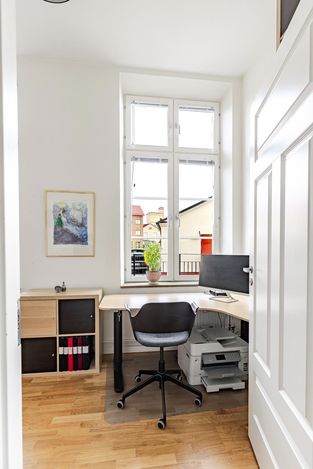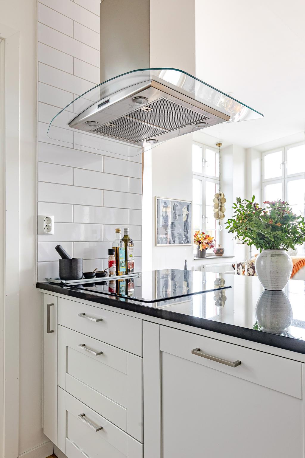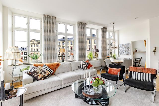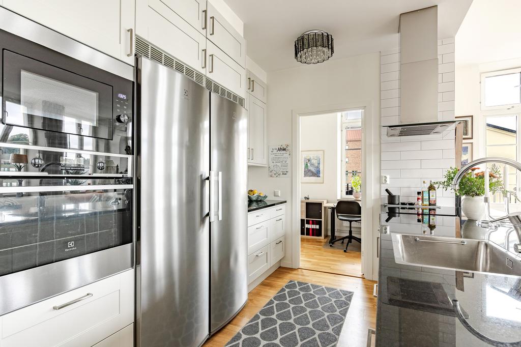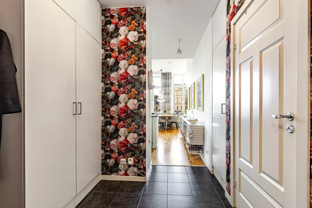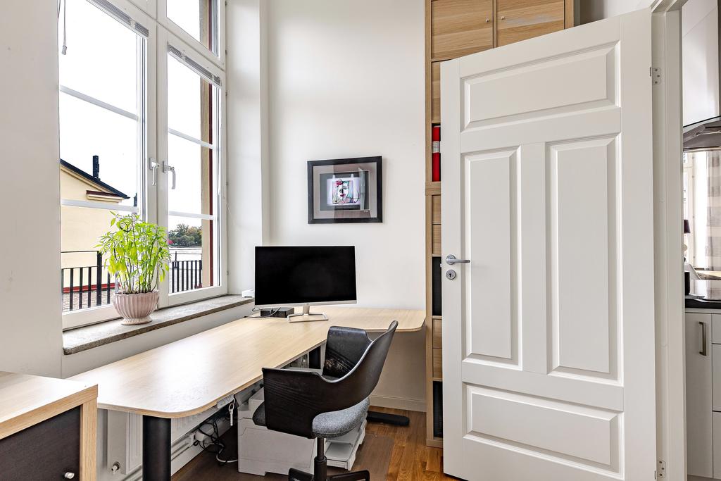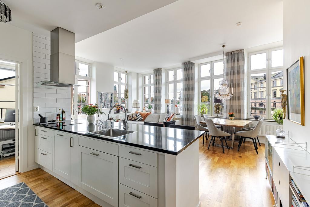 Redan i entréhallen anas bostadens karaktär och rymd. Rakt fram möts man av sociala ytor med kök och vardagsrum i öppen planlösning och hela 3,2 m i takhöjd. De höga spröjsade fönstren, som domineras av utsikten av vattnet, kulturkvarterets lugna kullerstensgator och den hänförande forsen intill gör att stadens puls känns långt, långt borta. Ytorna är ljusa och moderna och materialvalen påkostade. Ett enhetligt parkettgolv och vita målade väggar knyter på ett naturligt sätt ihop ytorna och de djupa fönsternischernas råa betongbänkar skapar som en extra myshörna i fönstren, perfekt för en kopp te och en god bok med ån precis utanför. Lägenhetens något oregelbundna disposition skapar dessutom extra liv och karaktär åt rummen.