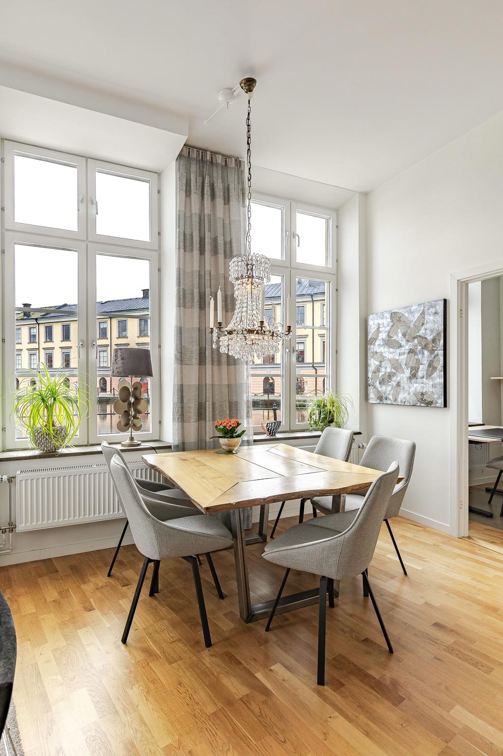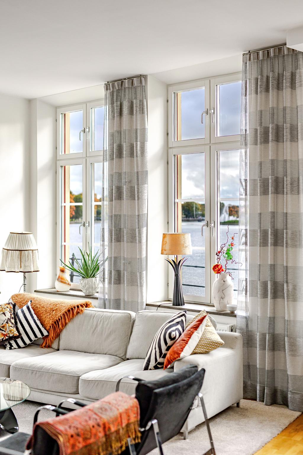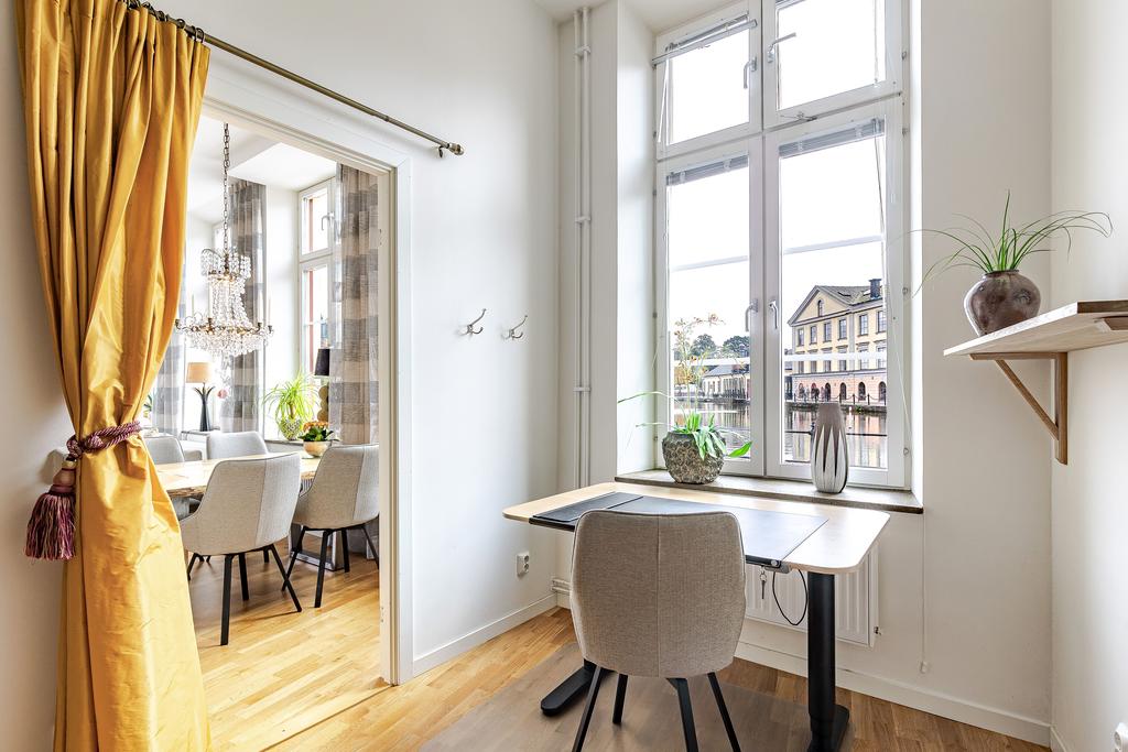 Med Eskilstunaåns glittrande vattenspegel utanför fönstren och det svarta smidesräcket utmed kajkanten känns det som att befinna sig på en båt. Vattnet, sekelskiftets rymd och ljus är det som präglar vårt hem på Kanonhusholmen.