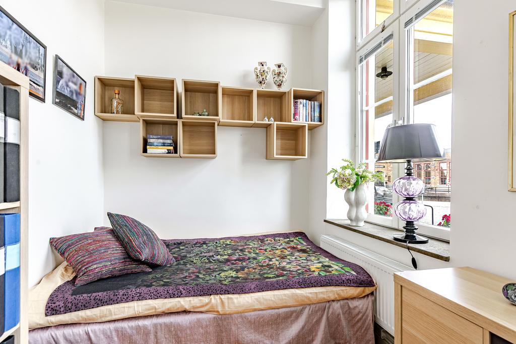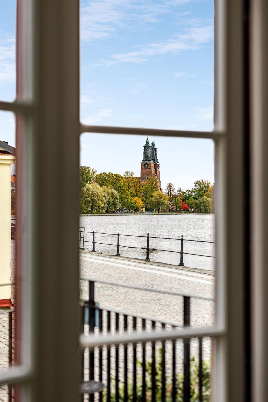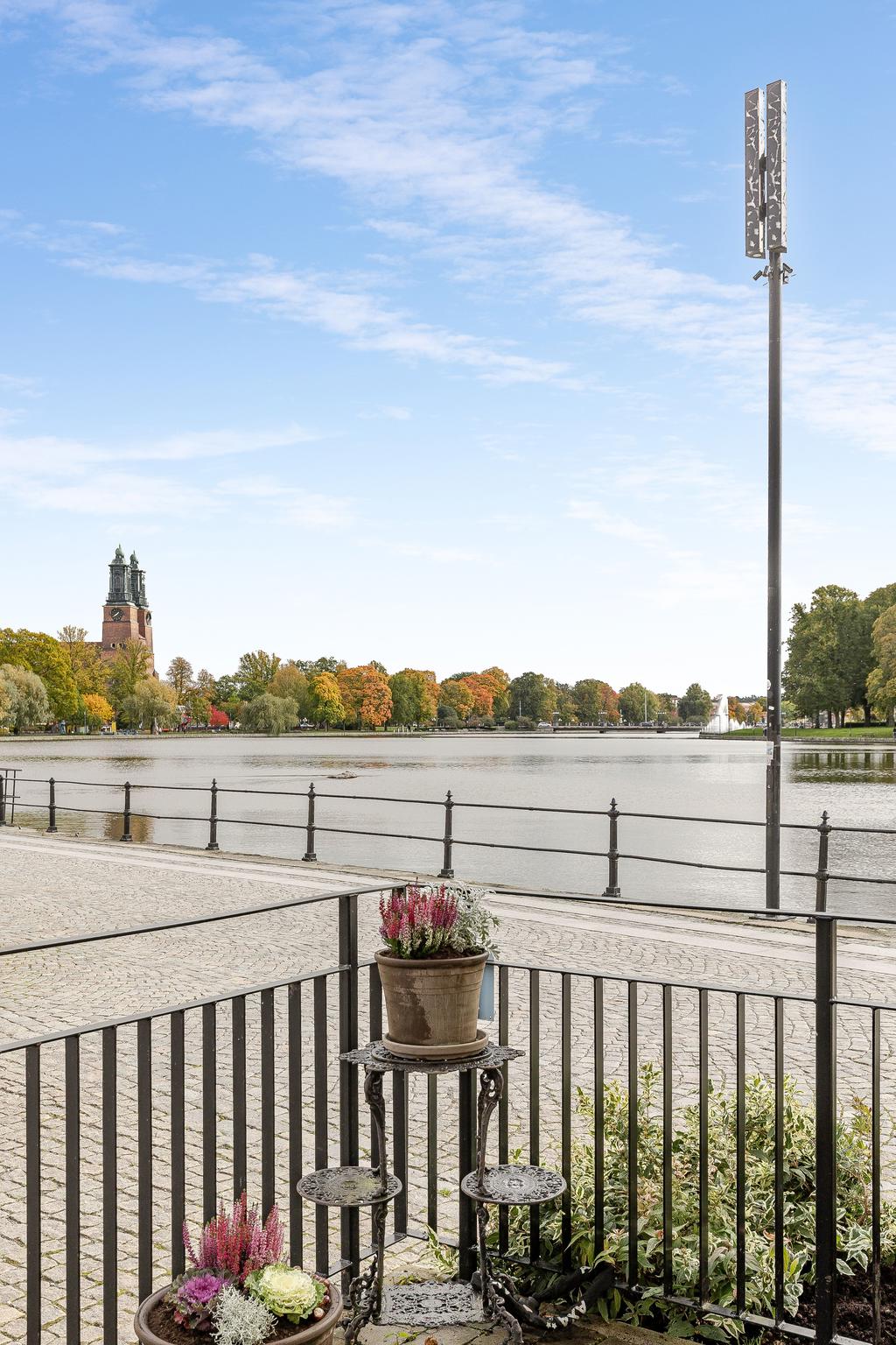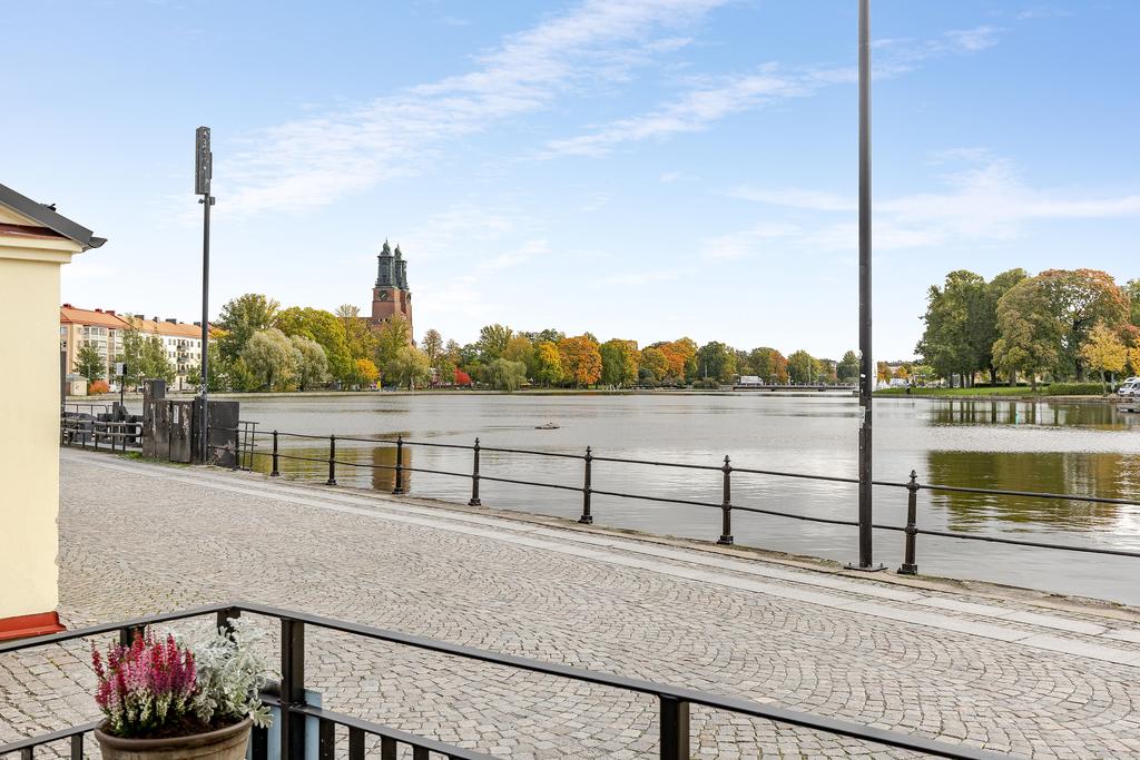 Med Eskilstunaåns glittrande vattenspegel utanför fönstren och det svarta smidesräcket utmed kajkanten känns det som att befinna sig på en båt. Vattnet, sekelskiftets rymd och ljus är det som präglar vårt hem på Kanonhusholmen.