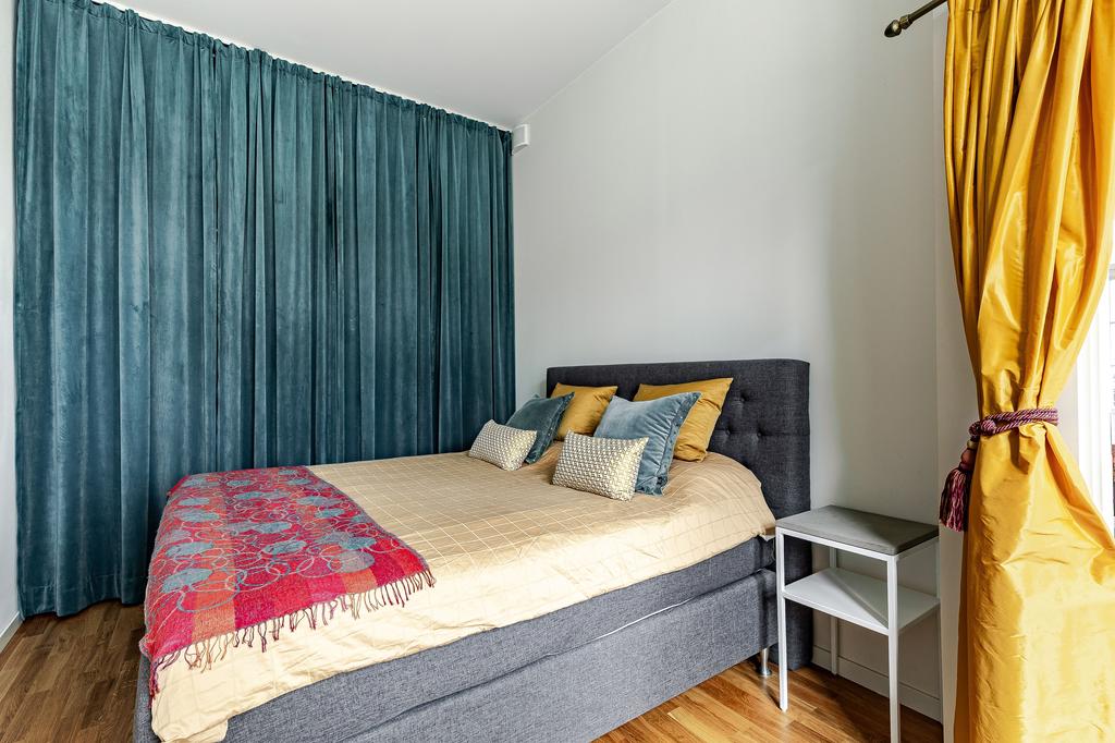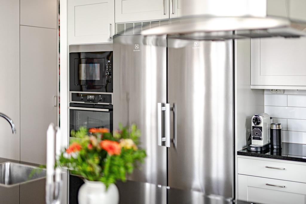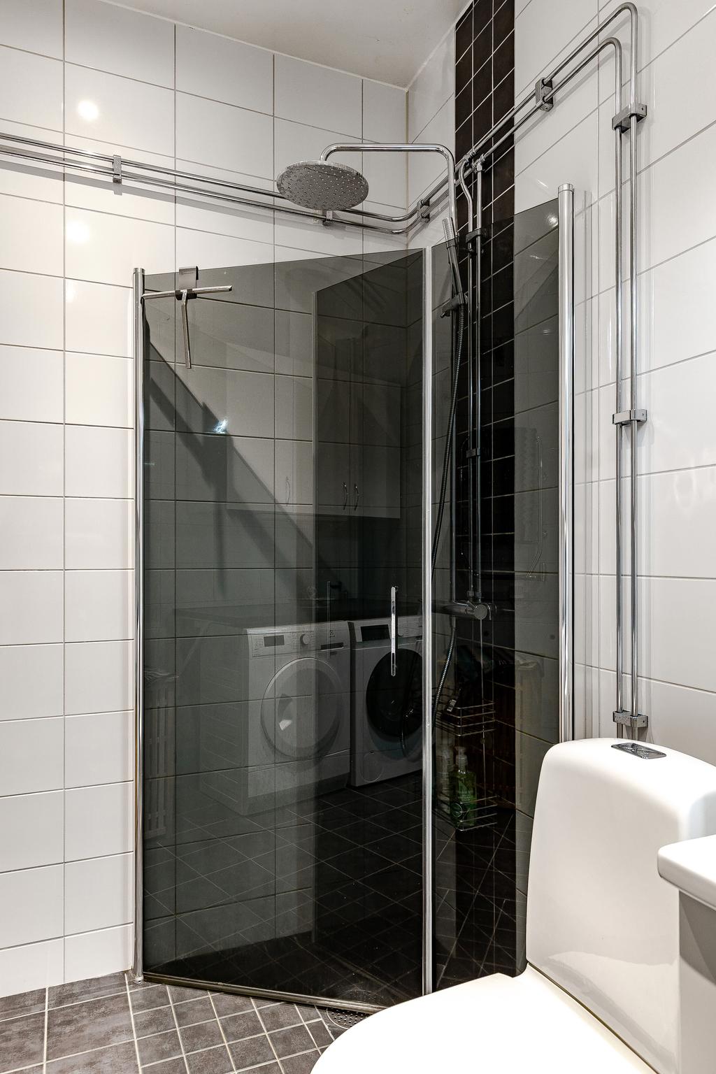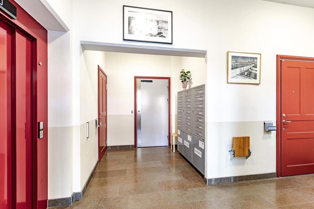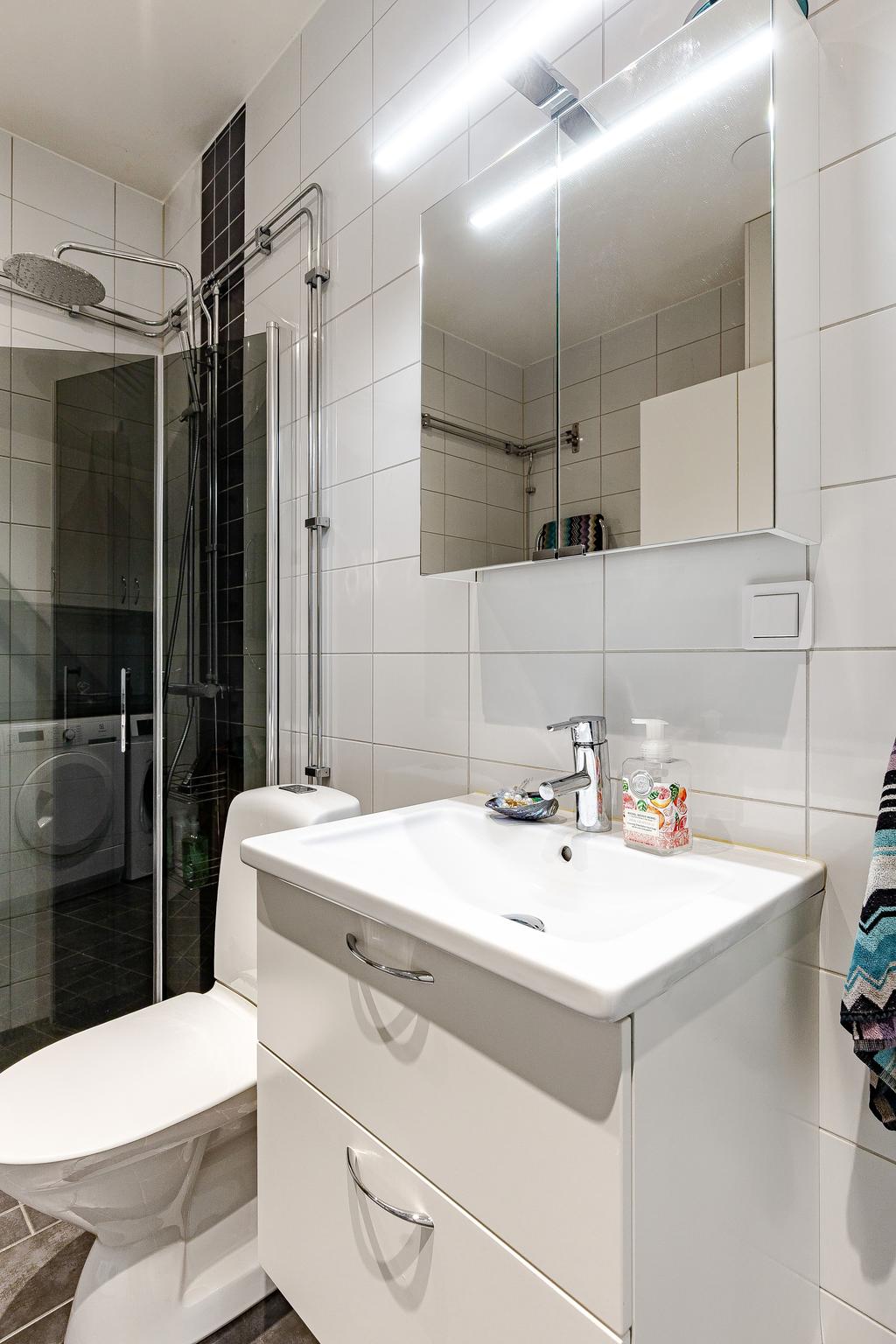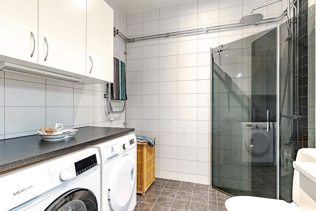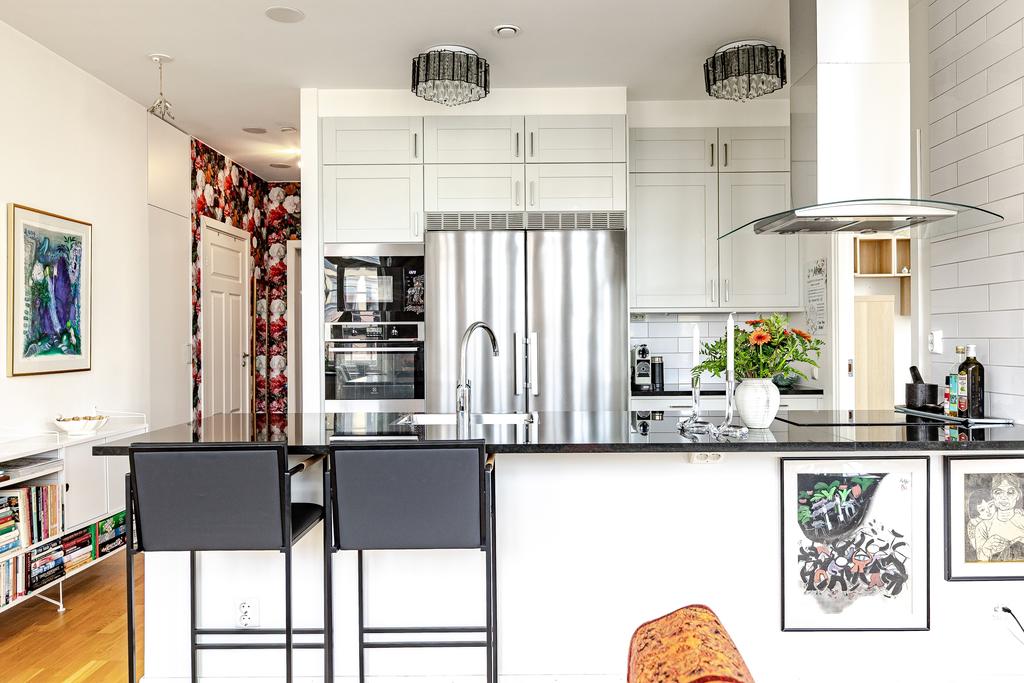 I anslutning till vardagsrummet nås ett rymligt master-bedroom med hel garderobsvägg och från köket nås ett något mindre sovrum som passar perfekt som gästrum och hemmakontor. Fönstret i det större sovrummet har en reflekterande folie som ger full sikt ut, men som gör att det inte går att se in i lägenheten utifrån. Från hallen nås ett lyxigt helkaklat badrum med golvvärme, extra rymlig dusch med rökfärgade duschväggar och tvättavdelning med tvättmaskin och torktumlare. All belysning är dimbar, både inomhus och utomhus, vilket ger möjlighet att skapa en vacker och personlig ljussättning och effektfullt förhöja konst med riktade spotlights.