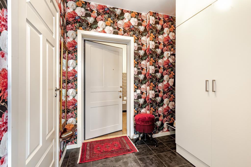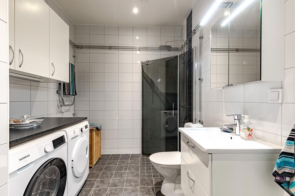 Hallen har ett stilrent och praktiskt klinkergolv och är utrustad med klädhängare, städskåp och garderober med rymligt förvaringsutrymme ovanpå. Det stilrena Vedum-köket är specialdesignat för sociala tillställningar och gemensam matlagning. På den svarta djupa granitbänken serveras det välkomstdrinkar, julbord och bakas pizzadegar. Barstolarna passar lika bra att slå sig ned på för gästerna, i väntan på att värden skakar ihop en iskall Moscow Mule, som till vardagens frukostmackor i farten. Inredningen har bra förvaring ända upp till full takhöjd och ljusgrå luckor med släta profiler, ett uttryck som återkommer i både entrédörr och innerdörrar. Såväl utformningen av köket, bänkskivor som vitvaror tillhör exklusivare tillval. Köket är utrustat med rostfri kyl och frys i fullhöjd, integrerad mikro, varmluftsugn och diskmaskin, frihängande fläkt samt induktionshäll med flexzoner. Vardagsrummets öppna planlösning ger gott om plats för både en rejäl soffgrupp och en matplats som rymmer både vänner och familj under årets högtider. Via vardagsrummets pardörrar nås din alldeles egna uteplats, inringad av ett dekorativt svart smidesstaket och med utsikt över vattnet. Har njuter du av sommarens grillkvällar medan kvällens allra sista strålar glittrar i vattnet.