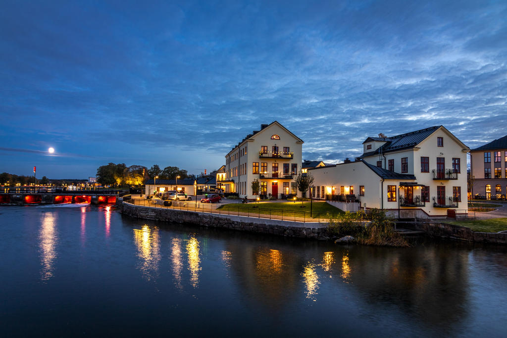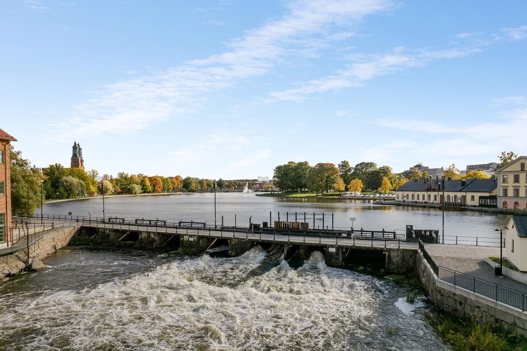 Med Eskilstunaåns glittrande vattenspegel utanför fönstren och det svarta smidesräcket utmed kajkanten känns det som att befinna sig på en båt. Vattnet, sekelskiftets rymd och ljus är det som präglar vårt hem på Kanonhusholmen.