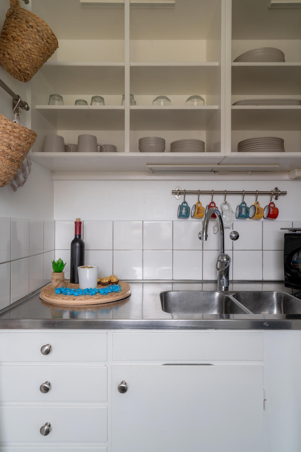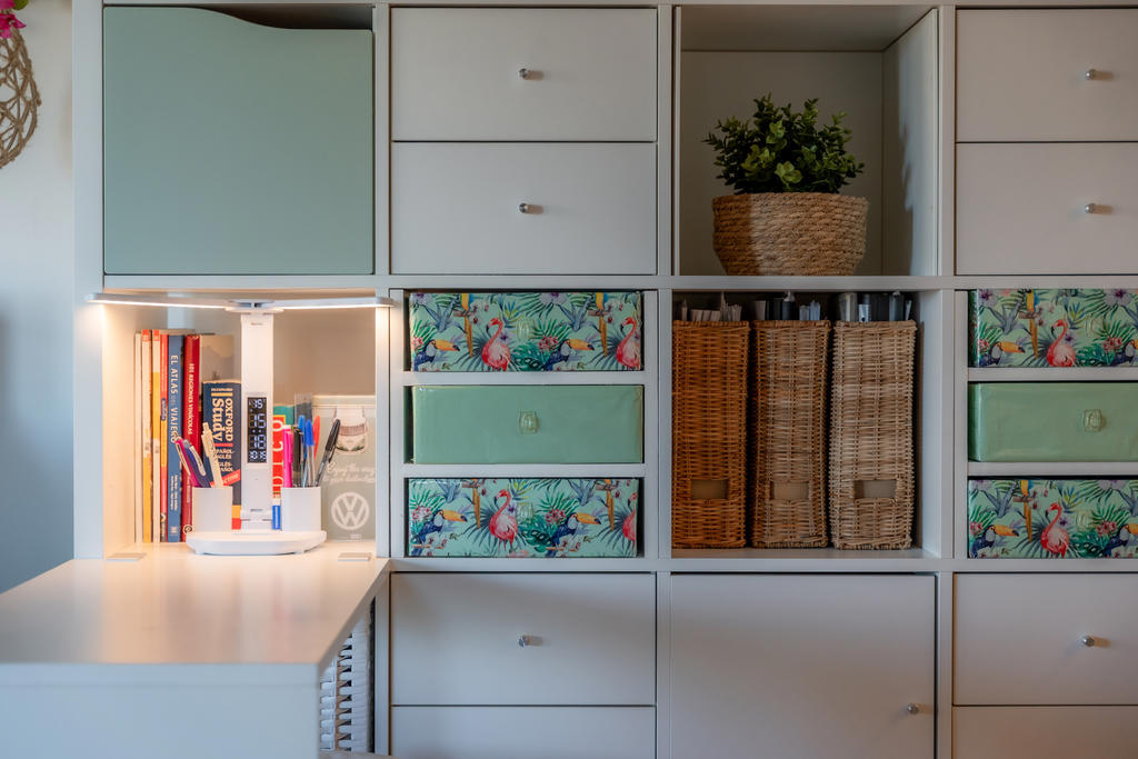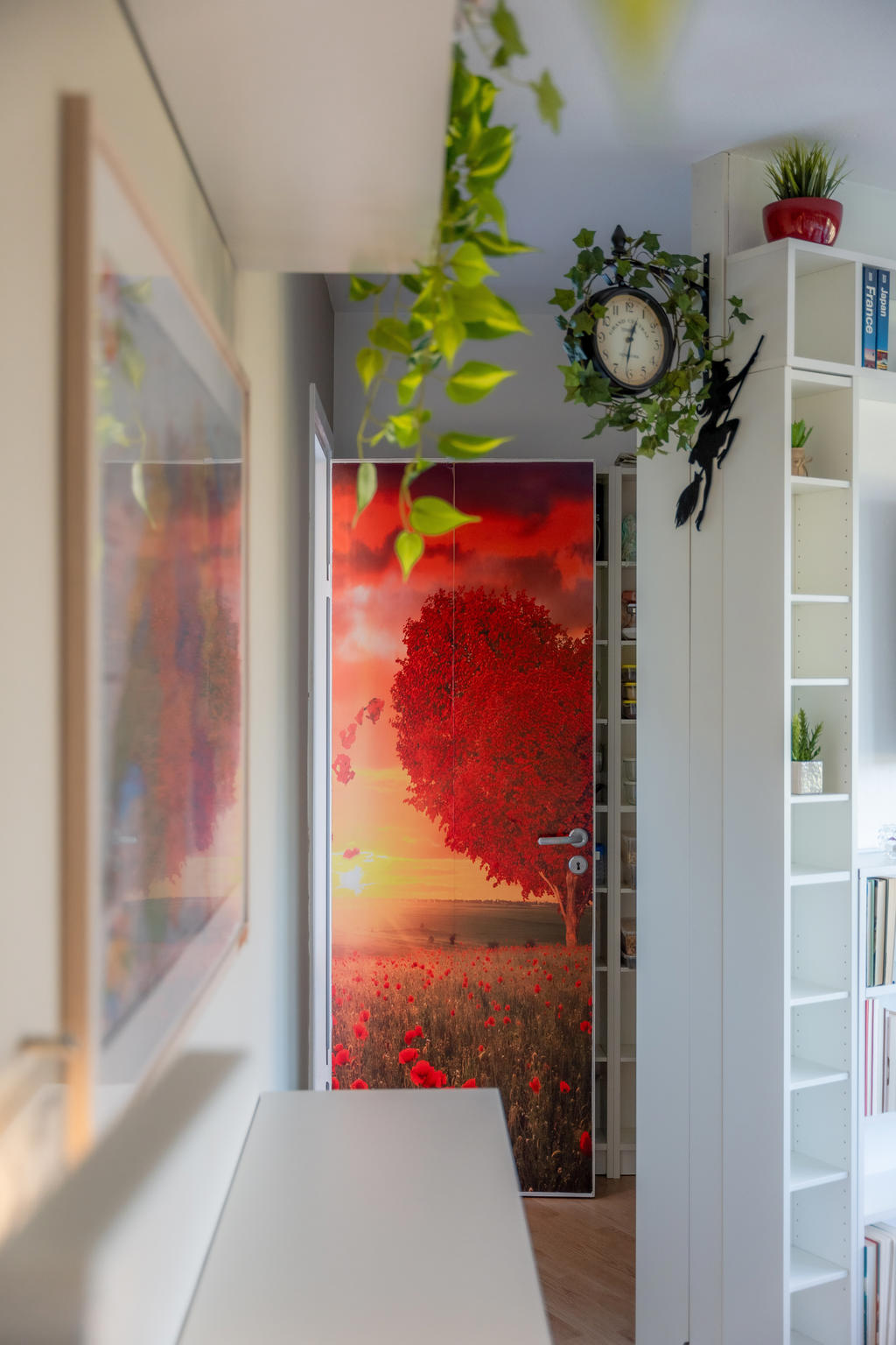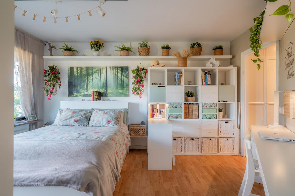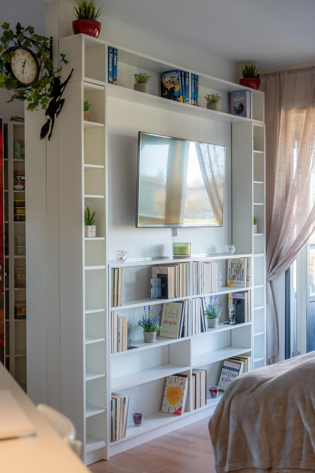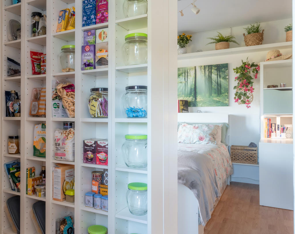 Lägenheten är välplanerad med fina ytskikt och smarta förvaringslösningar. Här finns gott om plats för kläder, resväskor och böcker tack vare genomtänkta hyllor, garderober och bordslösningar. Bakom TV-hyllan har nuvarande ägare skapat en praktisk dold förvaring för skafferivaror som kaffe, te och andra torrvaror – perfekt eftersom pentryt har begränsad men välutnyttjad yta.