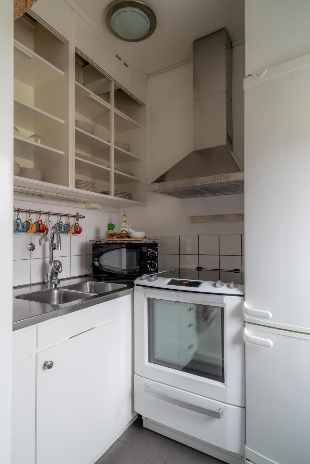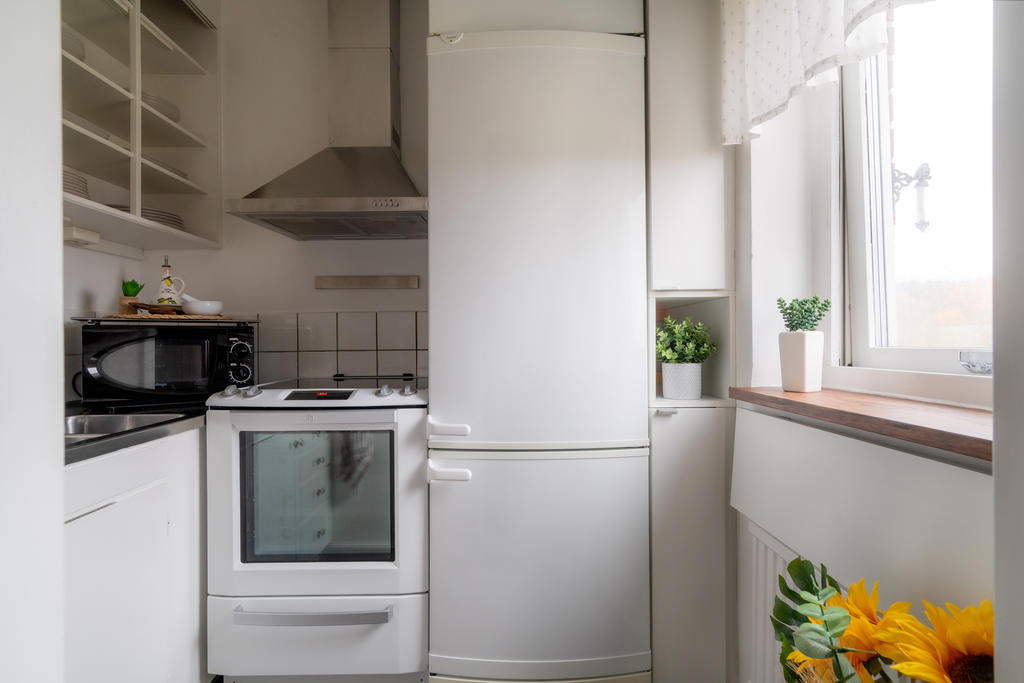 Det funktionella pentryt är utrustat med kyl, frys, ugn och spisplattor – allt du behöver för att kunna laga mat hemma.