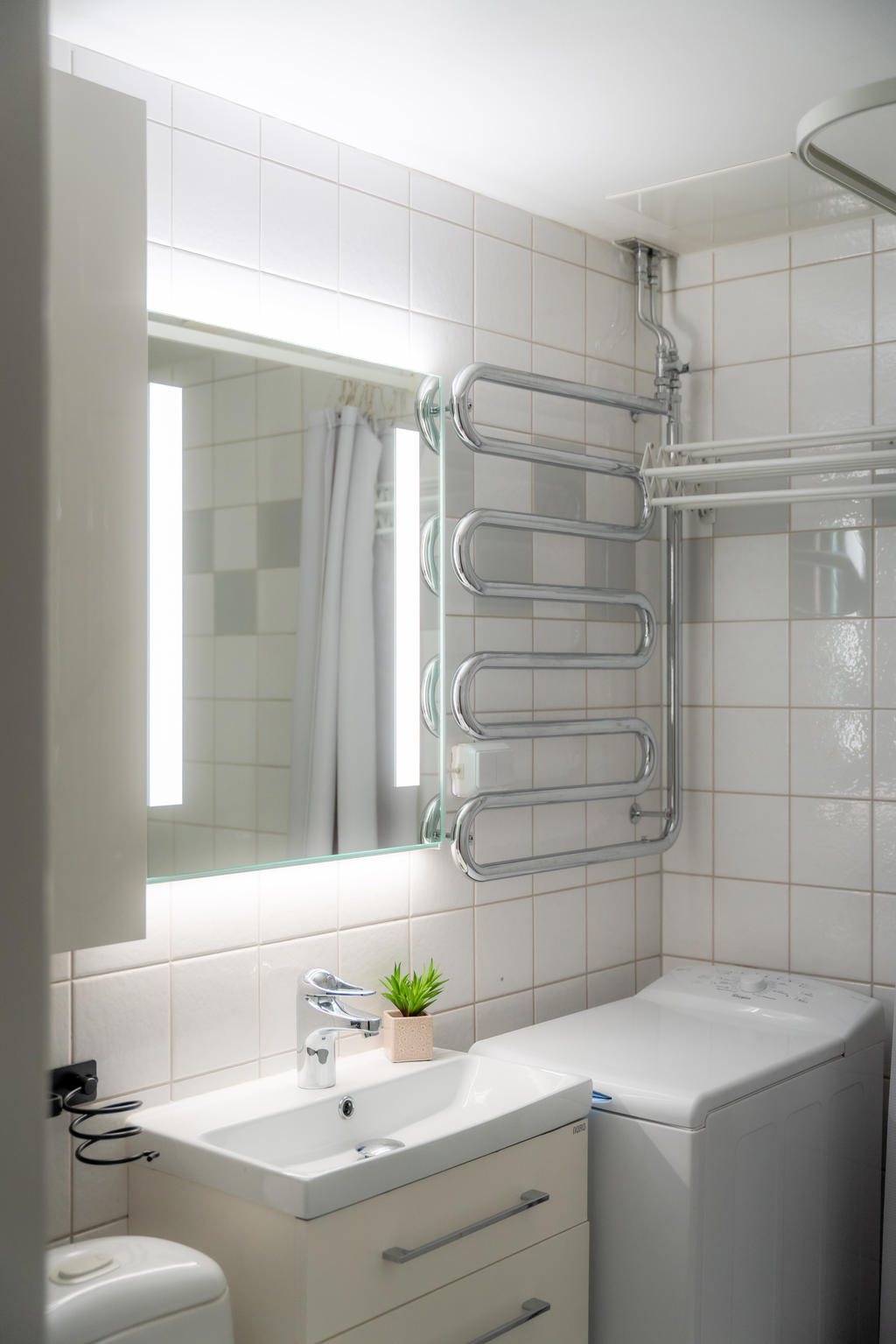 The bathroom is fresh and well-designed, featuring a washing machine, cabinets, WC, and shower. The mirror lighting includes a dimmer function for extra comfort.